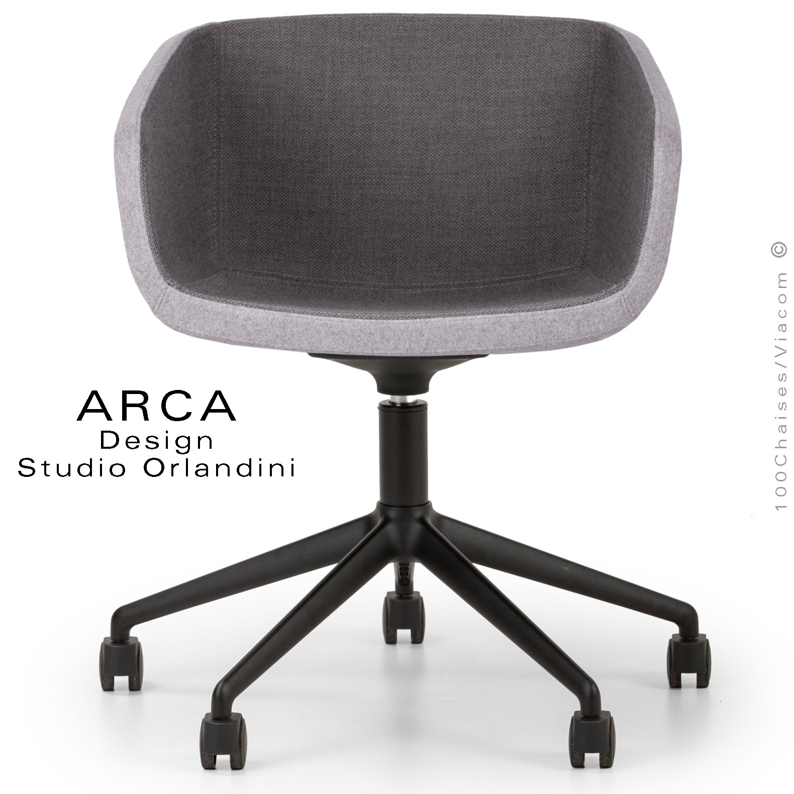Fauteuil de bureau ou domestique pivotant avec roulettes ARCA Mini, structure interne en acier. Assise, dossier et accoudoirs garnis de mousse moulée et injectée à froid, pivotante à 360°. Habillage tissu type feutre gamme ERA, 100% polyester du fabricant Camira, couleur au choix voir gamme fabricant. Piétement cinq branches en fonte d'aluminium, avec roulettes plastiques. Finition peinture noir ou autre au choix (suivant palette fabricant). Hauteur fixe.