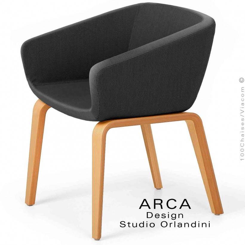 Fauteuil CHR ou domestique ARCA Mini, assise tissu couleur noir, piétement 4 pieds bois de Frêne vernis.