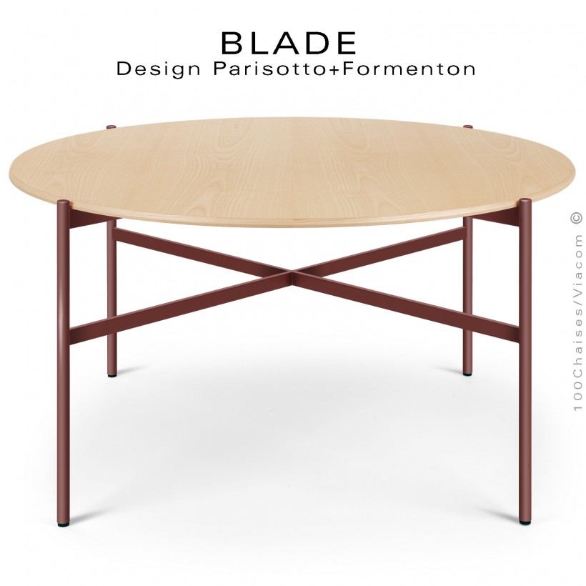 Table ronde minimaliste design BLADE, plateau Ø140 et 160 cm., plateau Frêne, piétement tube d'acier peint bordeaux.