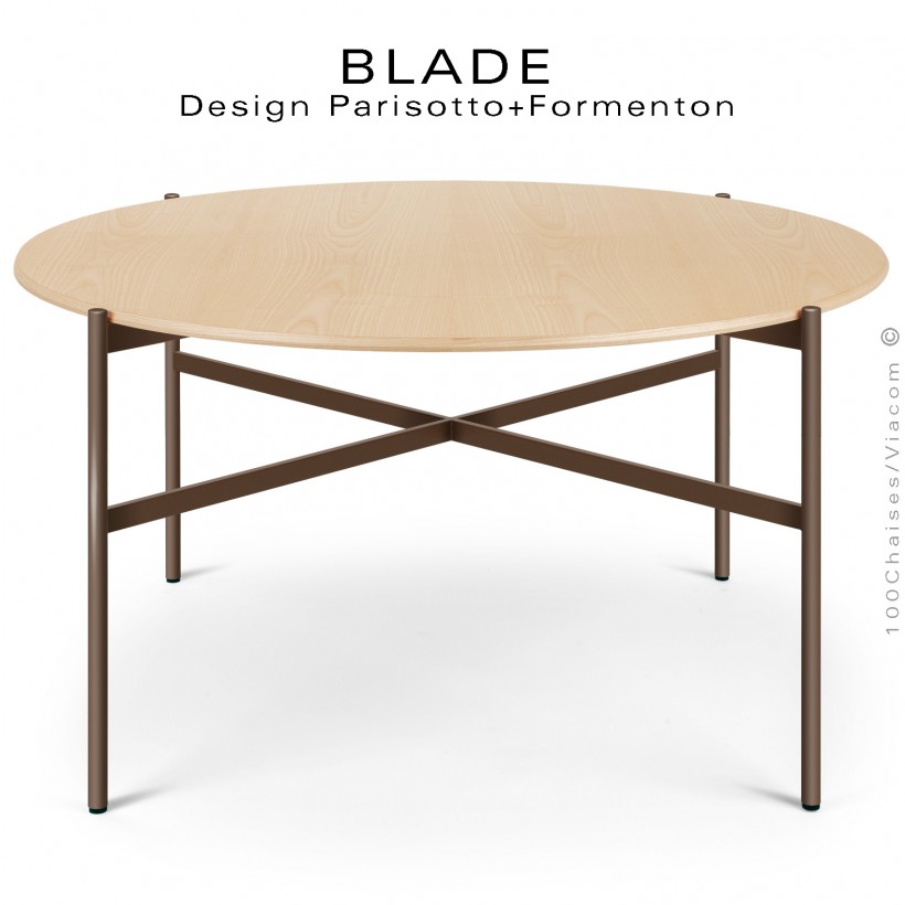 Table ronde minimaliste design BLADE, plateau Ø140 et 160 cm., plateau Frêne, piétement tube d'acier peint marron.