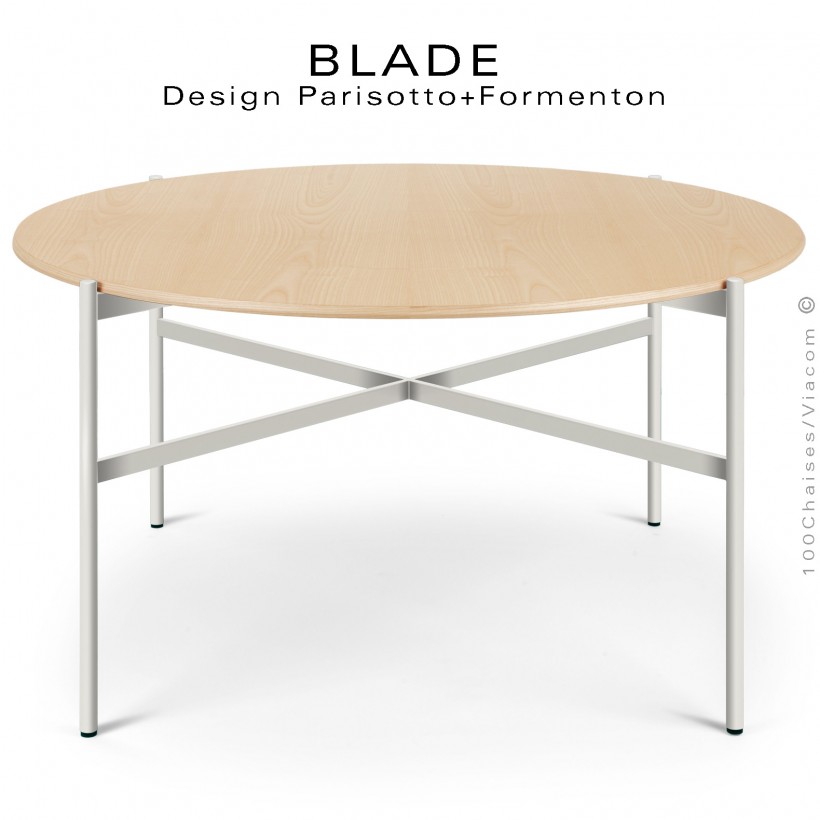 Table ronde minimaliste design BLADE, plateau Ø140 et 160 cm., plateau Frêne, piétement tube d'acier peint blanc.