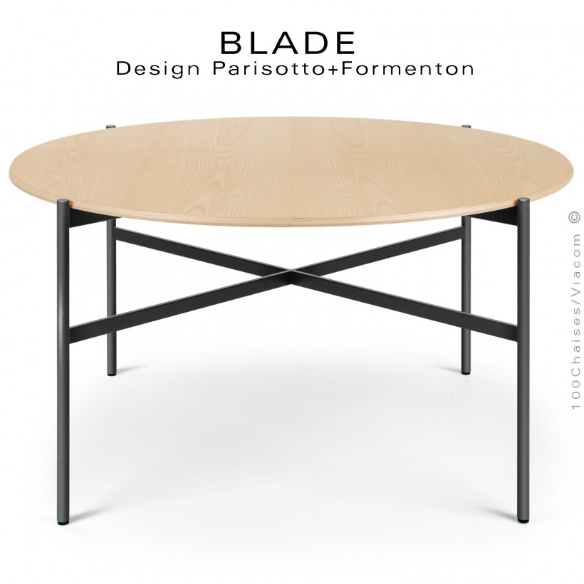 Table ronde minimaliste design BLADE, plateau Ø140 et 160 cm., plateau Frêne, piétement tube d'acier peint noir.