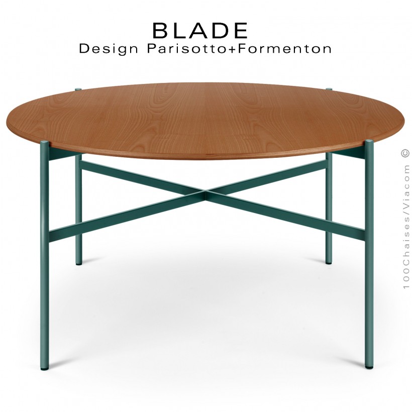 Table ronde minimaliste design BLADE, plateau Ø140 et 160 cm., plateau Noyer, piétement tube d'acier peint vert bouteille.