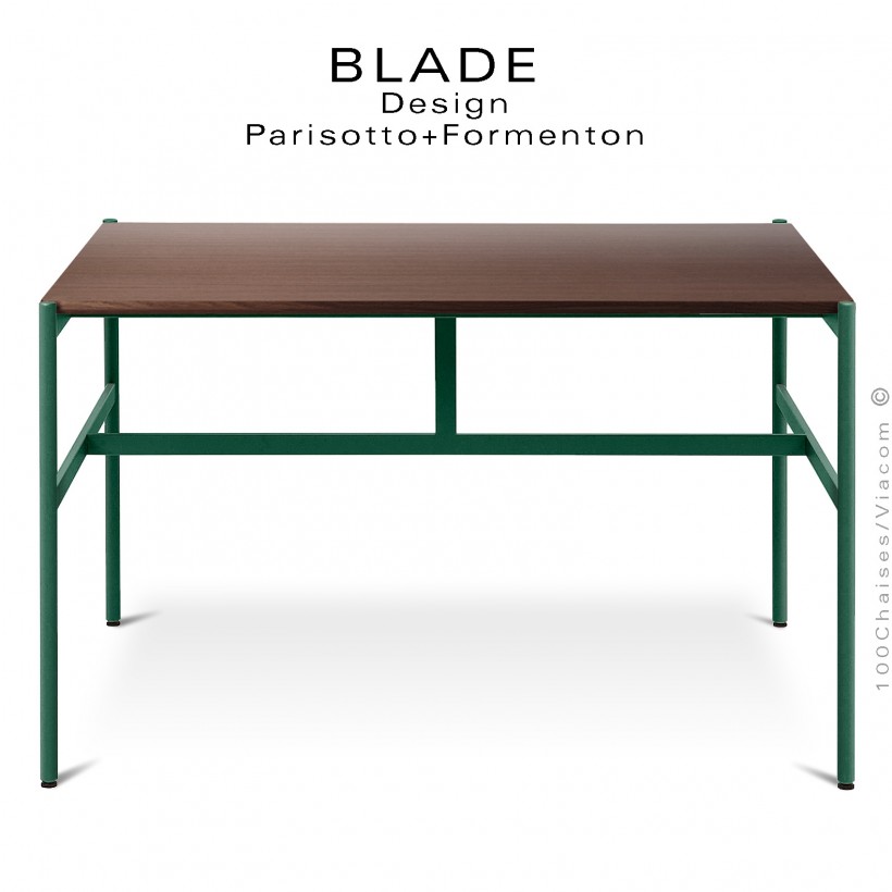 Table carré minimaliste design BLADE, plateau 145x145 cm., Chêne foncé, piétement tube d'acier peint vert bouteille.