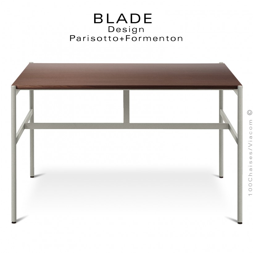 Table carré minimaliste design BLADE, plateau épaisseur 20 mm., dimensions 1450x1450 mm., type bois massif de Frêne, Chêne naturel et Chêne foncé ou Noyer, chant plateau arrondie. Piétement et structure en tube d'acier rond de 25 mm., et rectangulaire 12x45 mm., finition peinture au choix suivant gamme fabricant. Avec tampons plastiques de protections des sols.