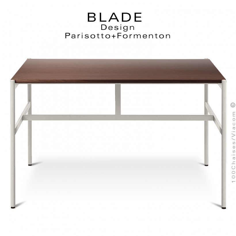 Table carré minimaliste design BLADE, plateau épaisseur 20 mm., dimensions 1450x1450 mm., type bois massif de Frêne, Chêne naturel et Chêne foncé ou Noyer, chant plateau arrondie. Piétement et structure en tube d'acier rond de 25 mm., et rectangulaire 12x45 mm., finition peinture au choix suivant gamme fabricant. Avec tampons plastiques de protections des sols.