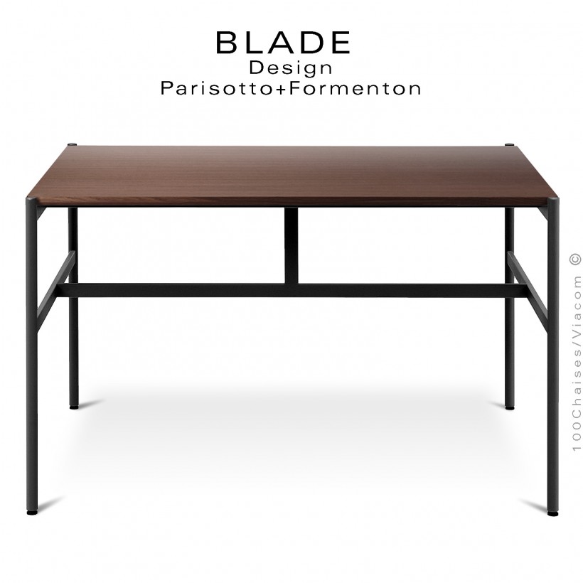 Table carré minimaliste design BLADE, plateau épaisseur 20 mm., dimensions 1450x1450 mm., type bois massif de Frêne, Chêne naturel et Chêne foncé ou Noyer, chant plateau arrondie. Piétement et structure en tube d'acier rond de 25 mm., et rectangulaire 12x45 mm., finition peinture au choix suivant gamme fabricant. Avec tampons plastiques de protections des sols.