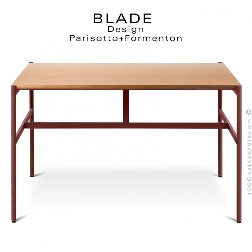 Table carré minimaliste design BLADE, plateau épaisseur 20 mm., dimensions 1450x1450 mm., type bois massif de Frêne, Chêne naturel et Chêne foncé ou Noyer, chant plateau arrondie. Piétement et structure en tube d'acier rond de 25 mm., et rectangulaire 12x45 mm., finition peinture au choix suivant gamme fabricant. Avec tampons plastiques de protections des sols.