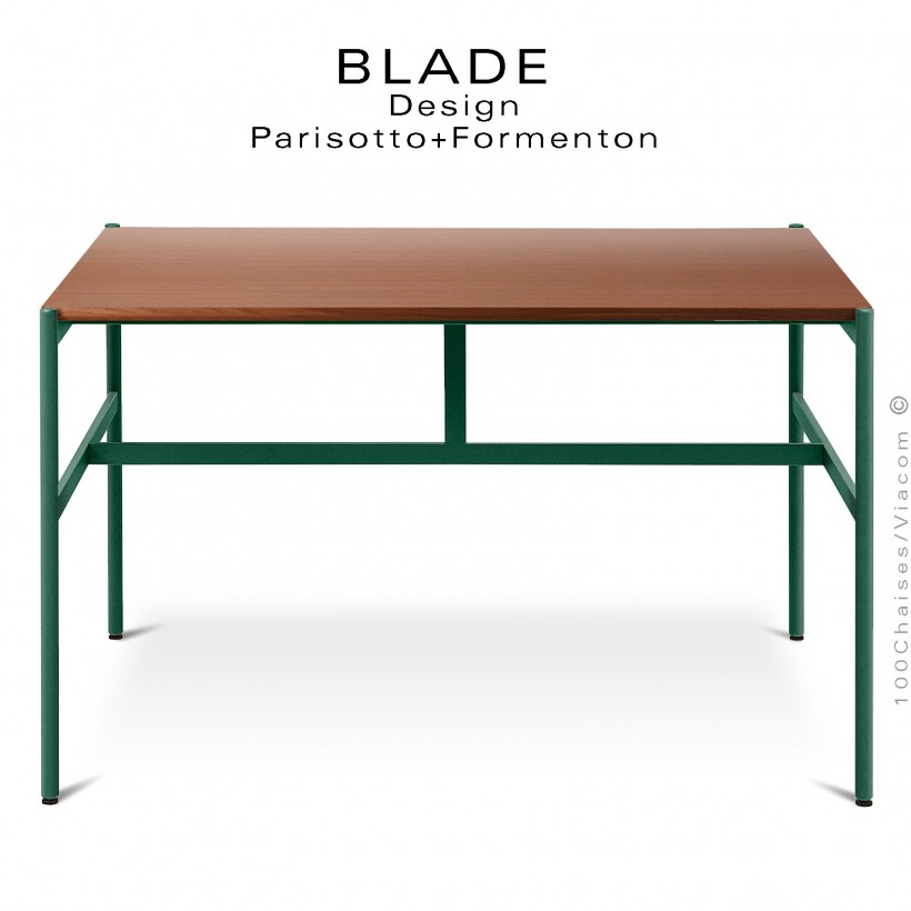 Table carré minimaliste design BLADE, plateau 145x145 cm., Noyer, piétement tube d'acier peint vert bouteille.