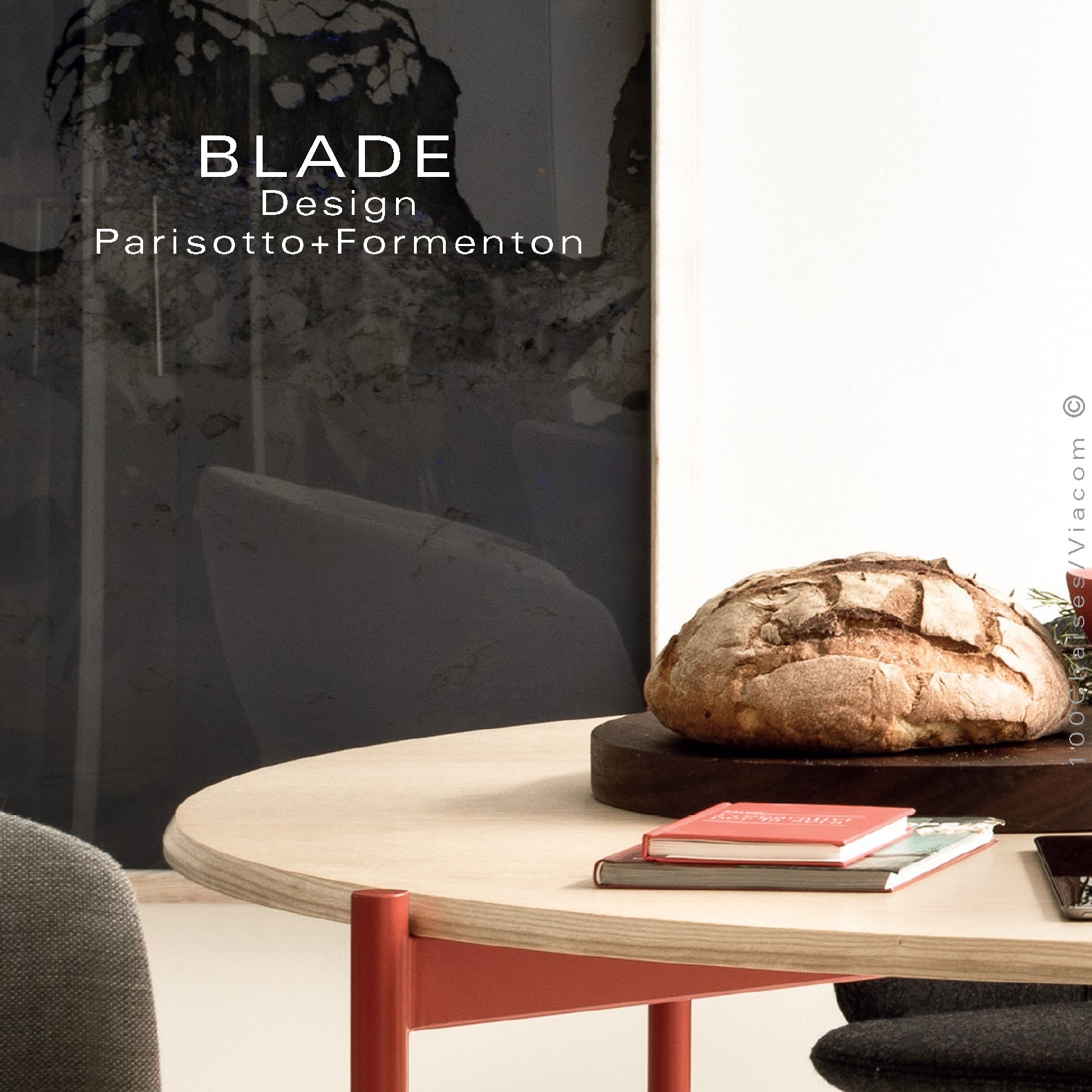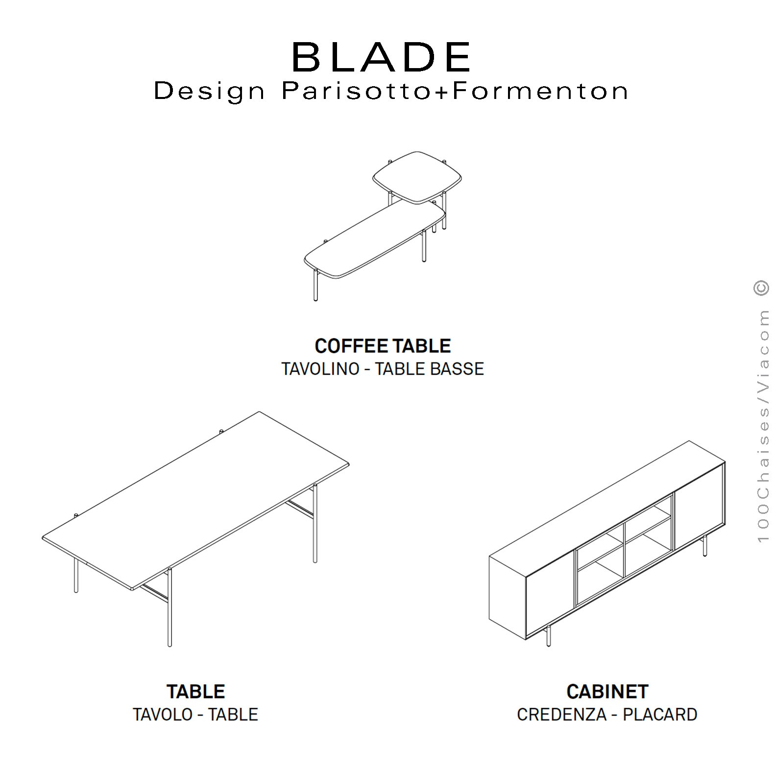 La légèreté visuelle de ses plateaux — disponibles en bois massif ou en verre laqué pour une touche plus contemporaine — s’allie à la finesse métallique de sa structure. Ce jeu subtil de contrastes crée une harmonie parfaite, révélant tout le brillant créatif et l’esprit avant-gardiste de la collection Blade.