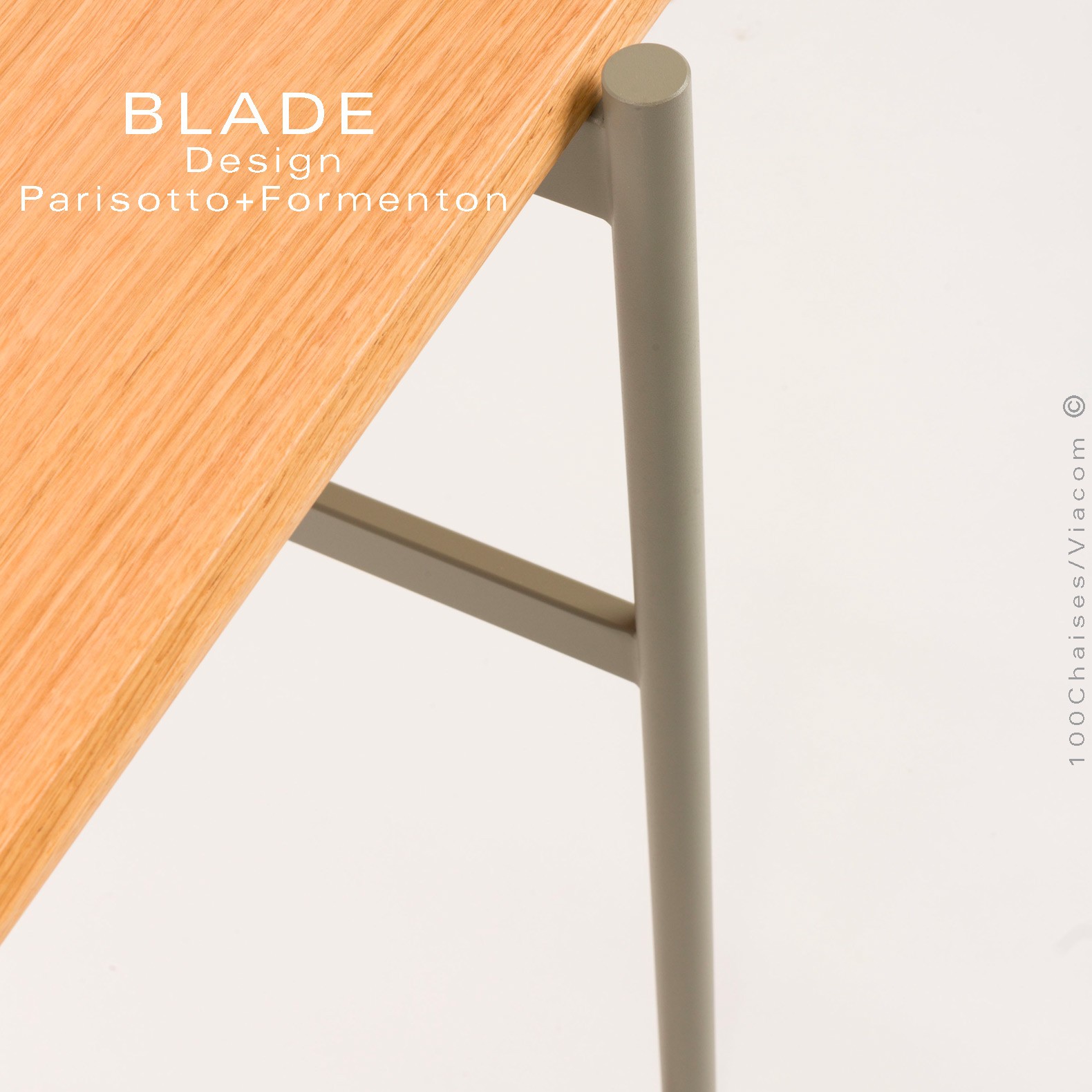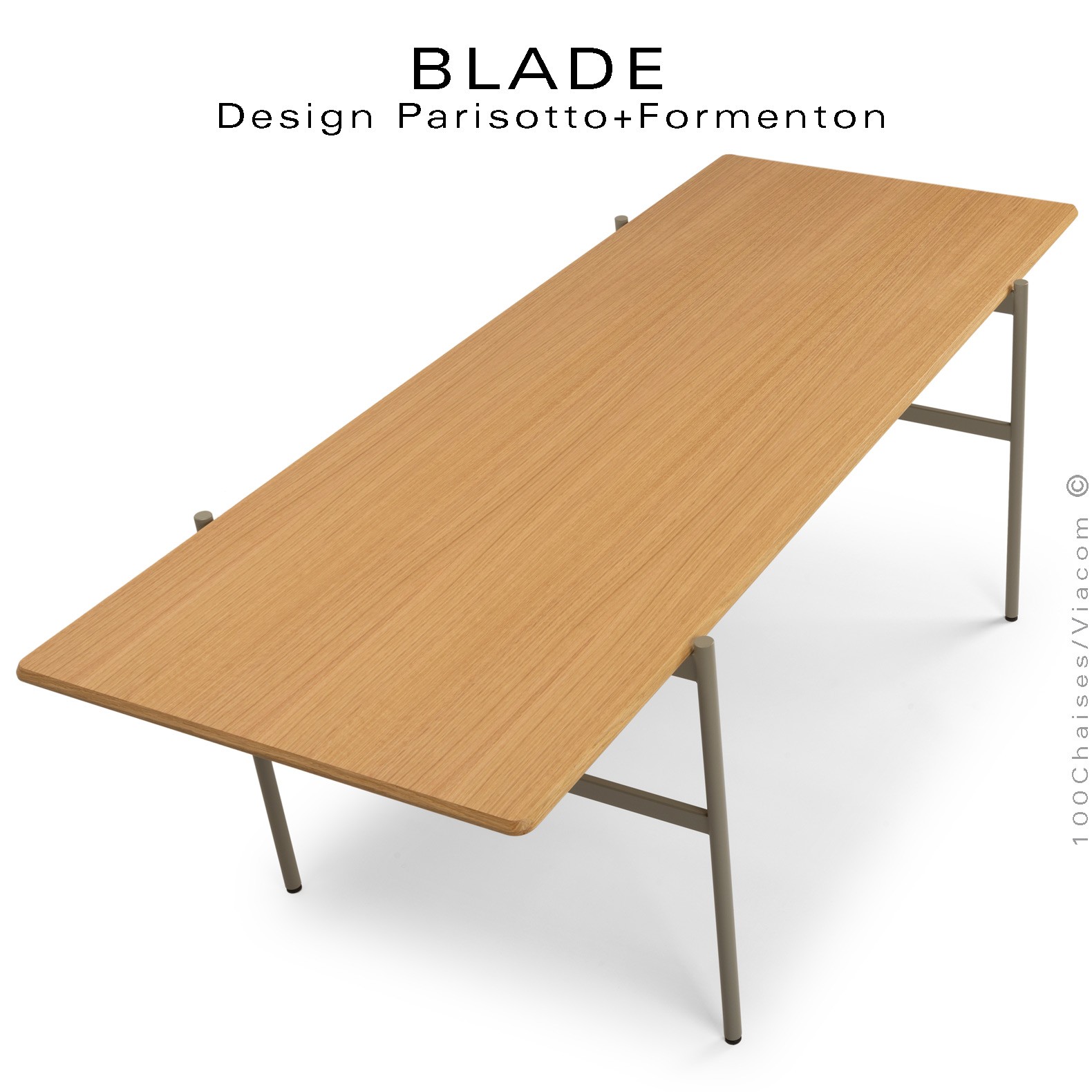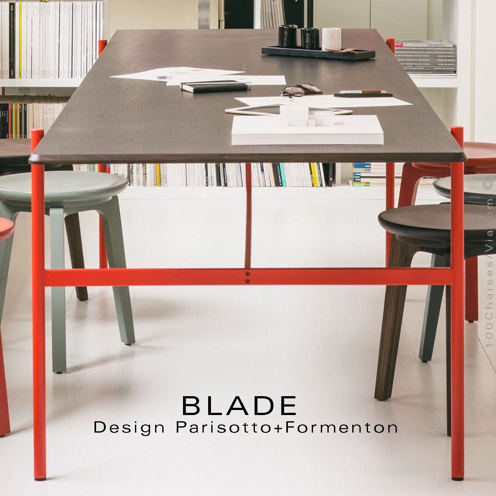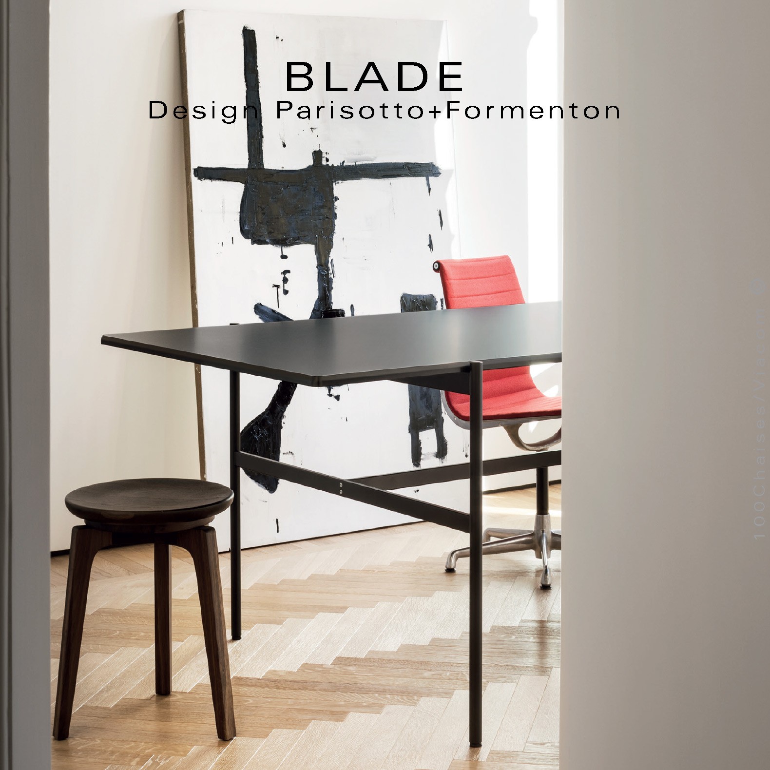 Table carré minimaliste design BLADE, plateau épaisseur 20 mm., dimensions 1450x1450 mm., type bois massif de Frêne, Chêne naturel et Chêne foncé ou Noyer, chant plateau arrondie. Piétement et structure en tube d'acier rond de 25 mm., et rectangulaire 12x45 mm., finition peinture au choix suivant gamme fabricant. Avec tampons plastiques de protections des sols.