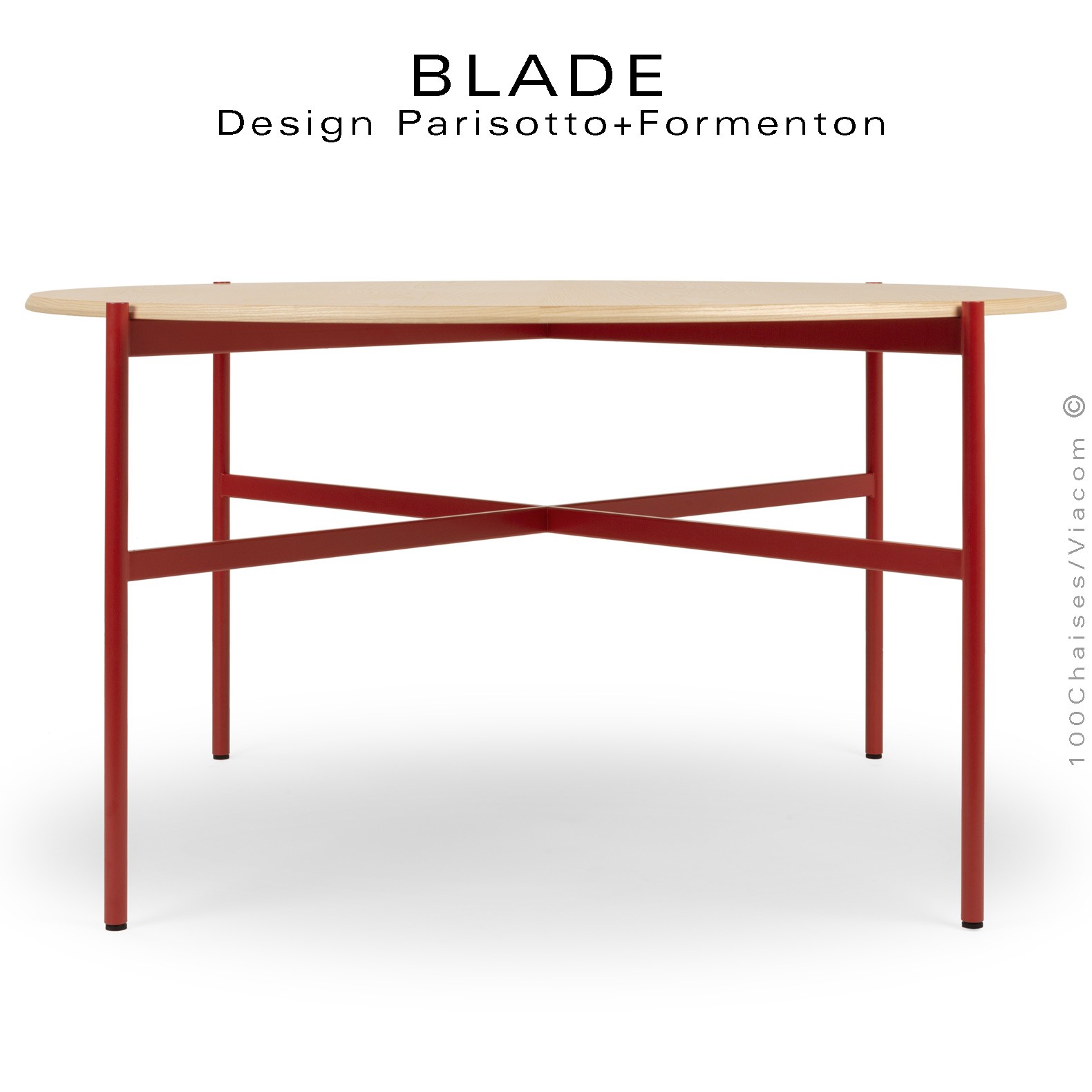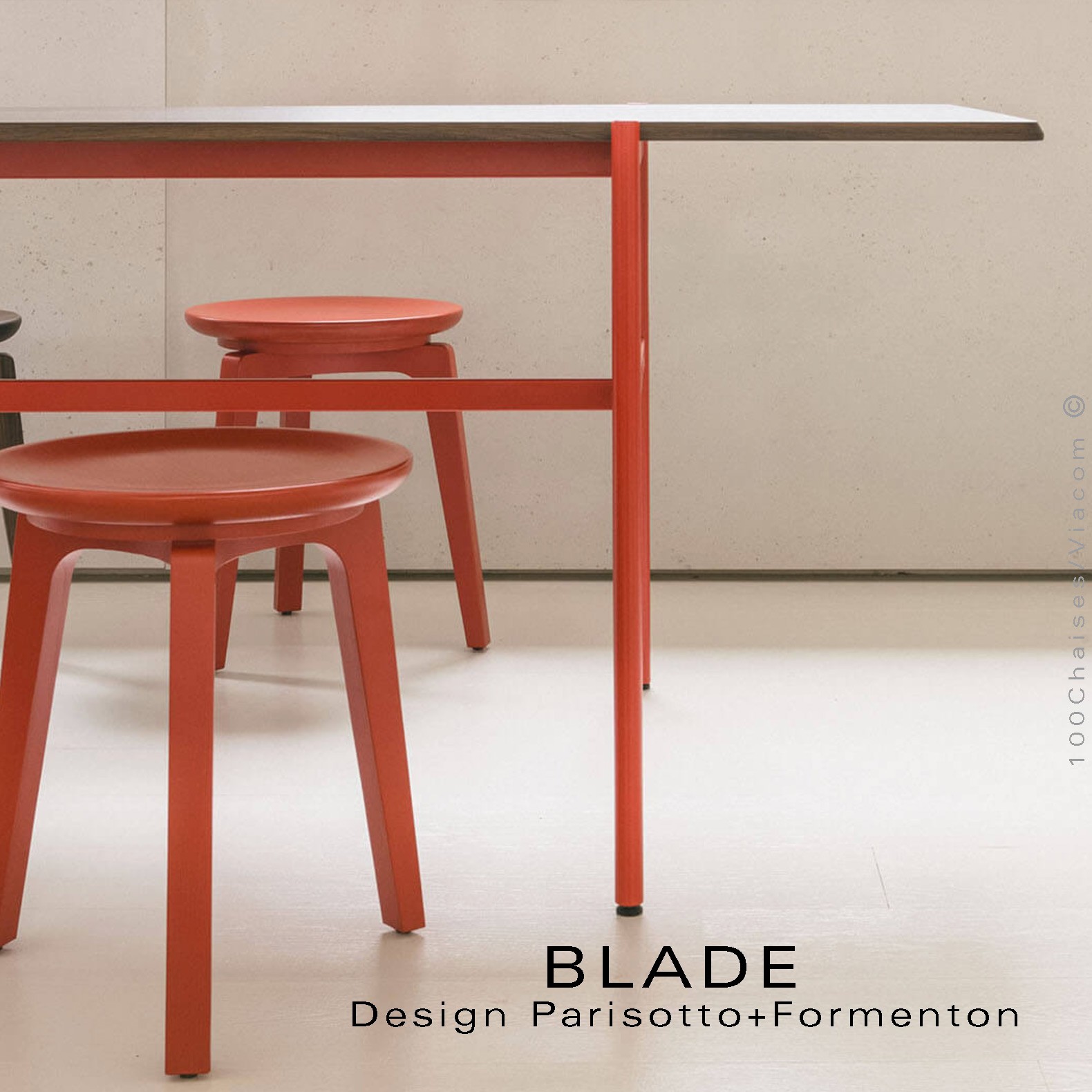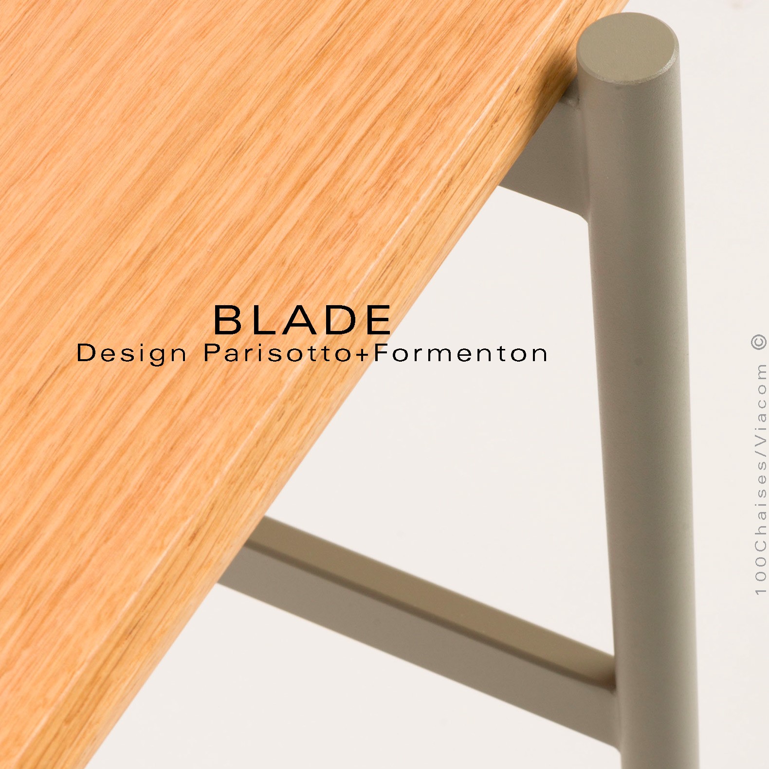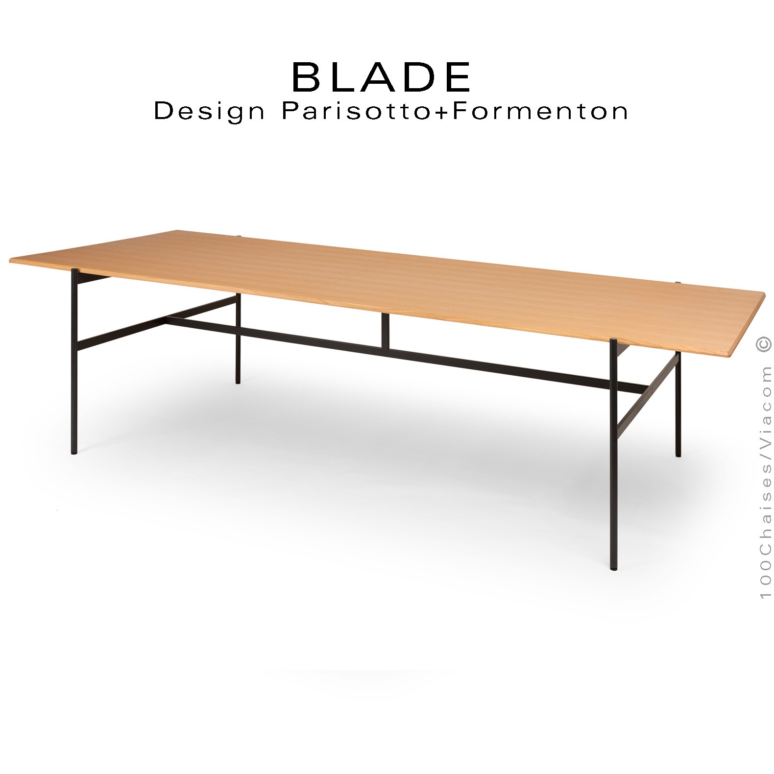 Table carré minimaliste design BLADE, plateau épaisseur 20 mm., dimensions 1450x1450 mm., type bois massif de Frêne, Chêne naturel et Chêne foncé ou Noyer, chant plateau arrondie. Piétement et structure en tube d'acier rond de 25 mm., et rectangulaire 12x45 mm., finition peinture au choix suivant gamme fabricant. Avec tampons plastiques de protections des sols.
