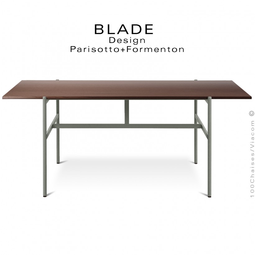 Table minimaliste design BLADE, plateau rectangulaire, Frêne, Chêne ou Noyer, piétement tube d'acier peint.