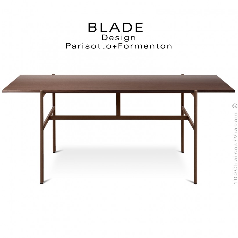 Table minimaliste design BLADE, plateau rectangulaire, chêne foncé, piétement tube d'acier peint marron.