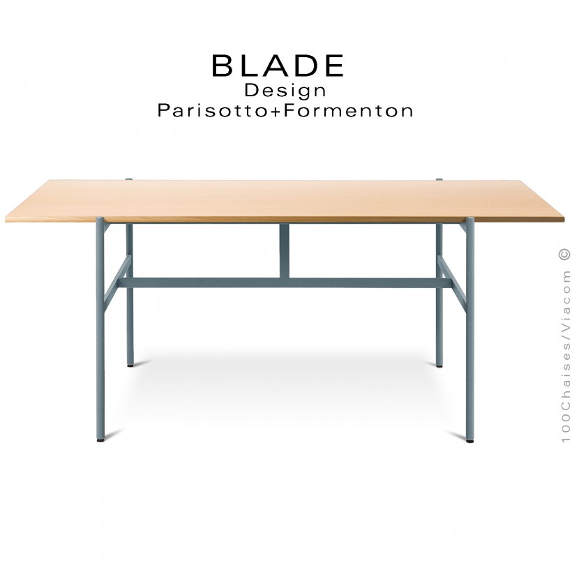 Table rectangulaire minimaliste design BLADE, plateau épaisseur 20 mm., dimensions longueurs de 1800 à 3000 mm., largeurs de 950 à 1250 mm., type bois massif de Frêne, Chêne naturel et Chêne foncé ou Noyer, chant plateau arrondie. Piétement et structure en tube d'acier rond de 25 mm., et rectangulaire 12x45 mm., finition peinture au choix suivant gamme fabricant. Avec tampons plastiques de protections des sols.