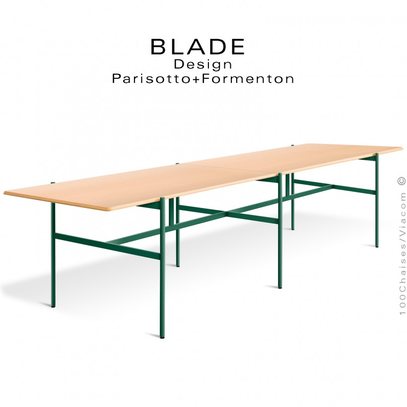 Grande table de réunion design BLADE, plateau rectangulaire, Frêne naturel, piétement tube d'acier peint vert bouteille.