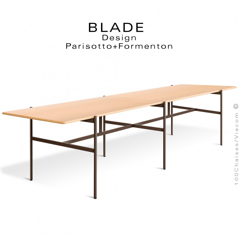 Grande table de réunion design BLADE, plateau rectangulaire, Frêne naturel, piétement tube d'acier peint marron.