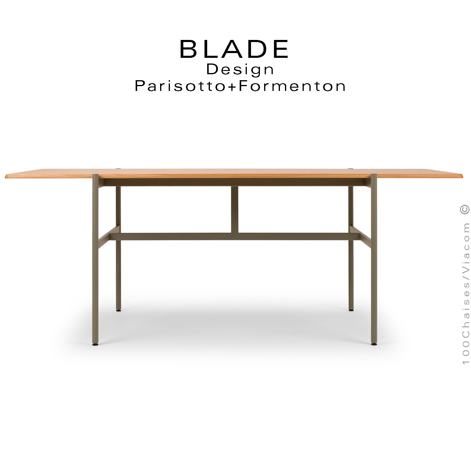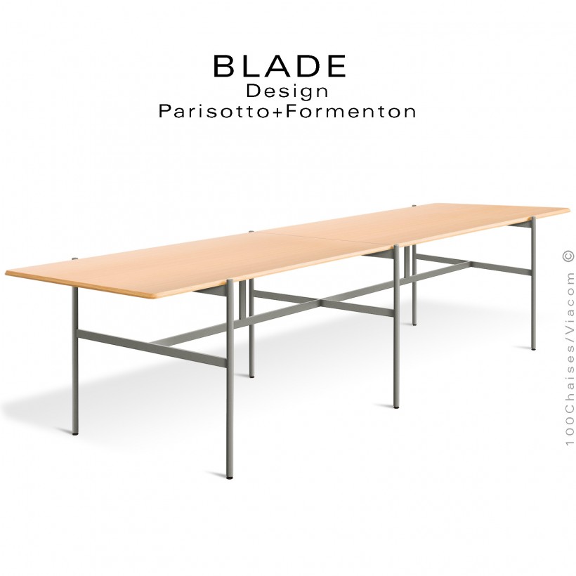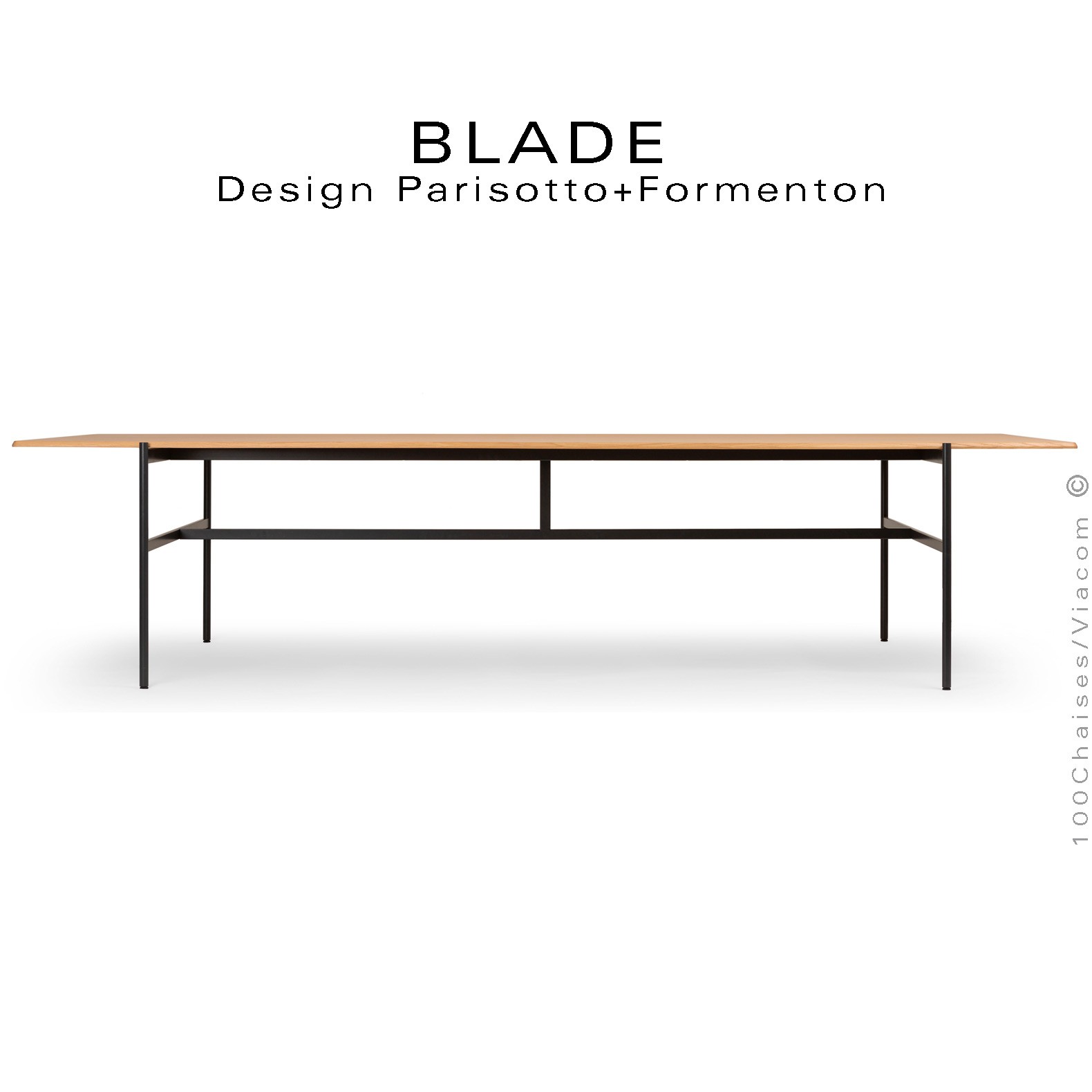 Grande table rectangulaire minimaliste design BLADE, plateau épaisseur 20 mm., en deux éléments, dimensions longueurs 3600 et 4200 mm., largeur 1250 mm., type bois massif de Frêne, Chêne naturel et Chêne foncé ou Noyer, chant plateau arrondie. Piétement et structure en tube d'acier rond de 25 mm., et rectangulaire 12x45 mm., finition peinture au choix suivant gamme fabricant. Avec tampons plastiques de protections des sols.