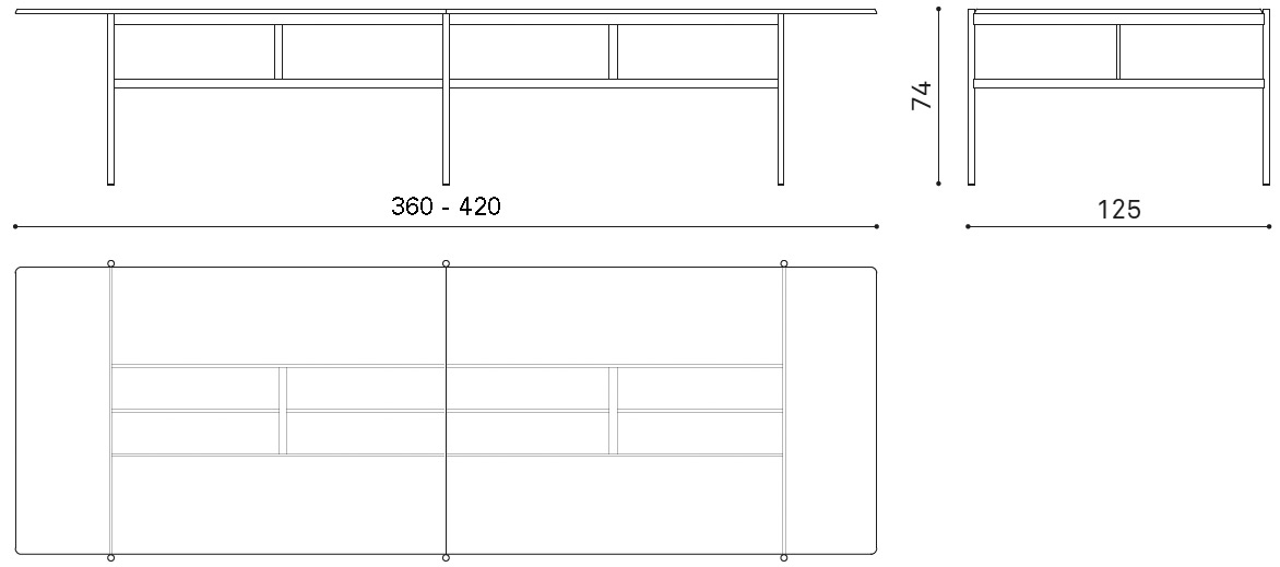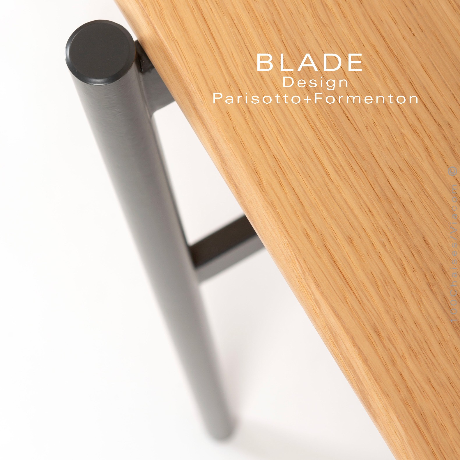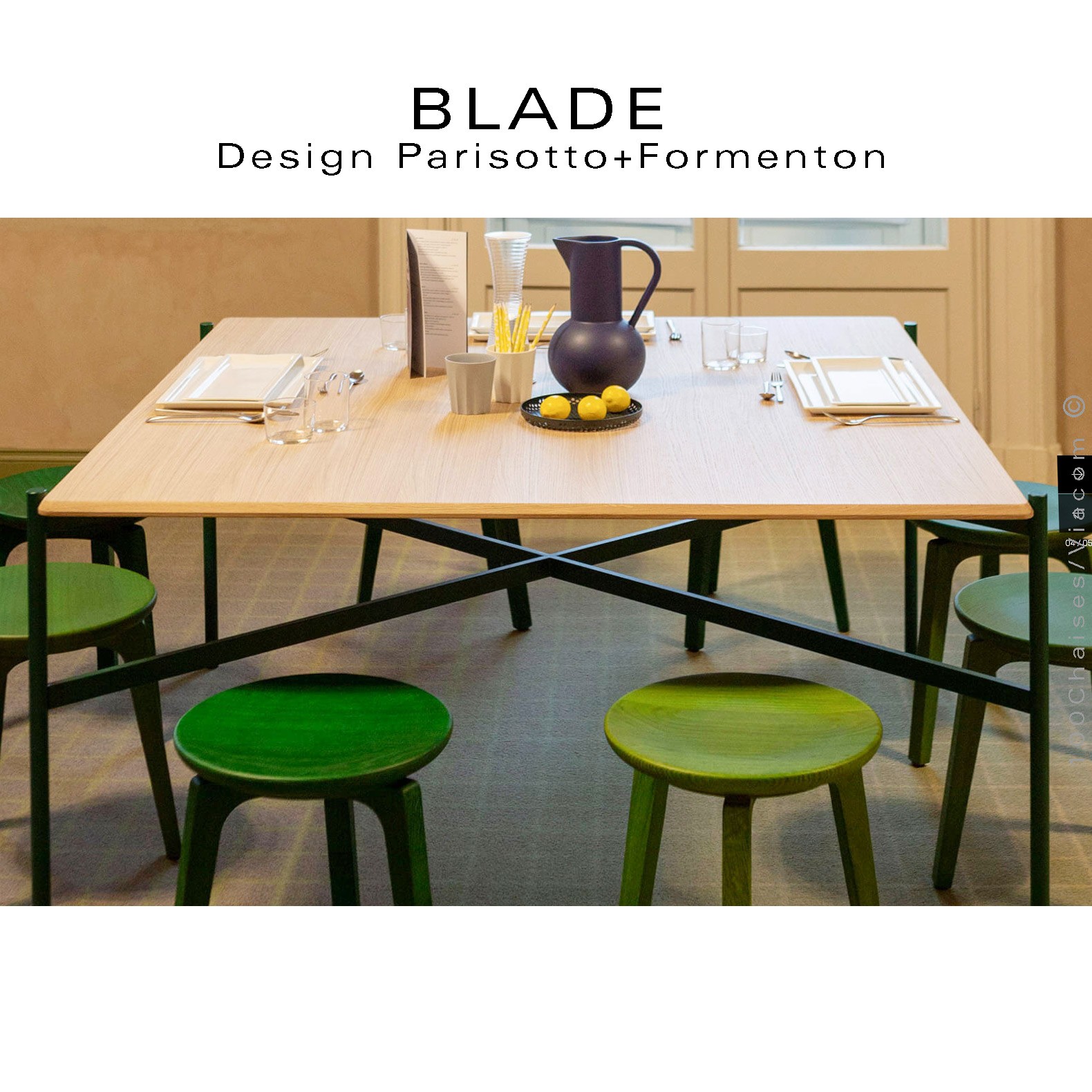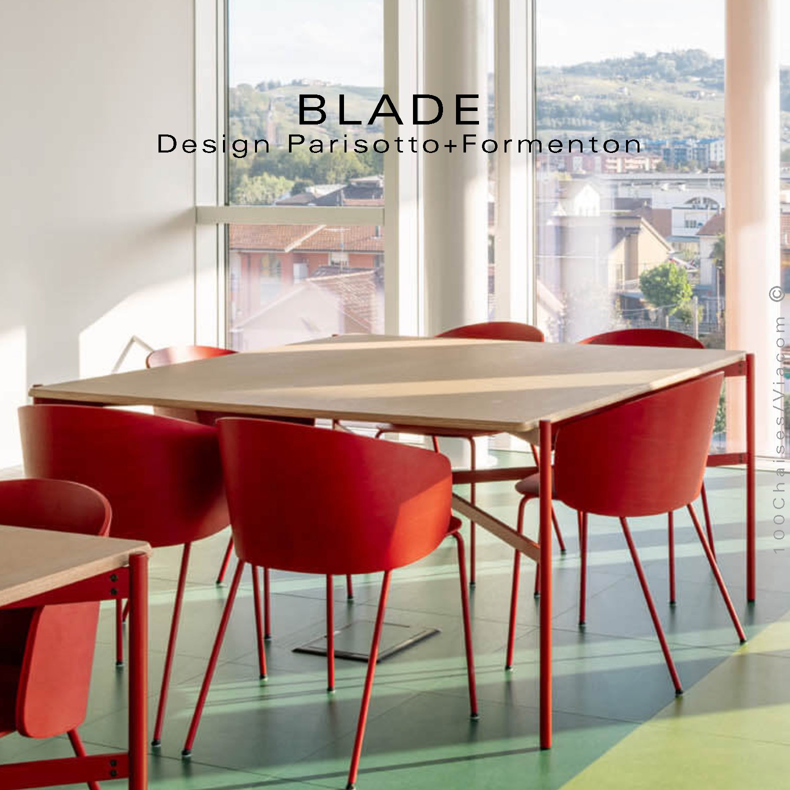 Grande table rectangulaire minimaliste design BLADE, plateau épaisseur 20 mm., en deux éléments, dimensions longueurs 3600 et 4200 mm., largeur 1250 mm., type bois massif de Frêne, Chêne naturel et Chêne foncé ou Noyer, chant plateau arrondie. Piétement et structure en tube d'acier rond de 25 mm., et rectangulaire 12x45 mm., finition peinture au choix suivant gamme fabricant. Avec tampons plastiques de protections des sols.