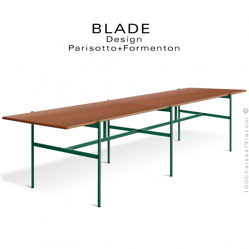 Grande table de réunion design BLADE, plateau rectangulaire, Noyer, piétement tube d'acier peint vert bouteille.