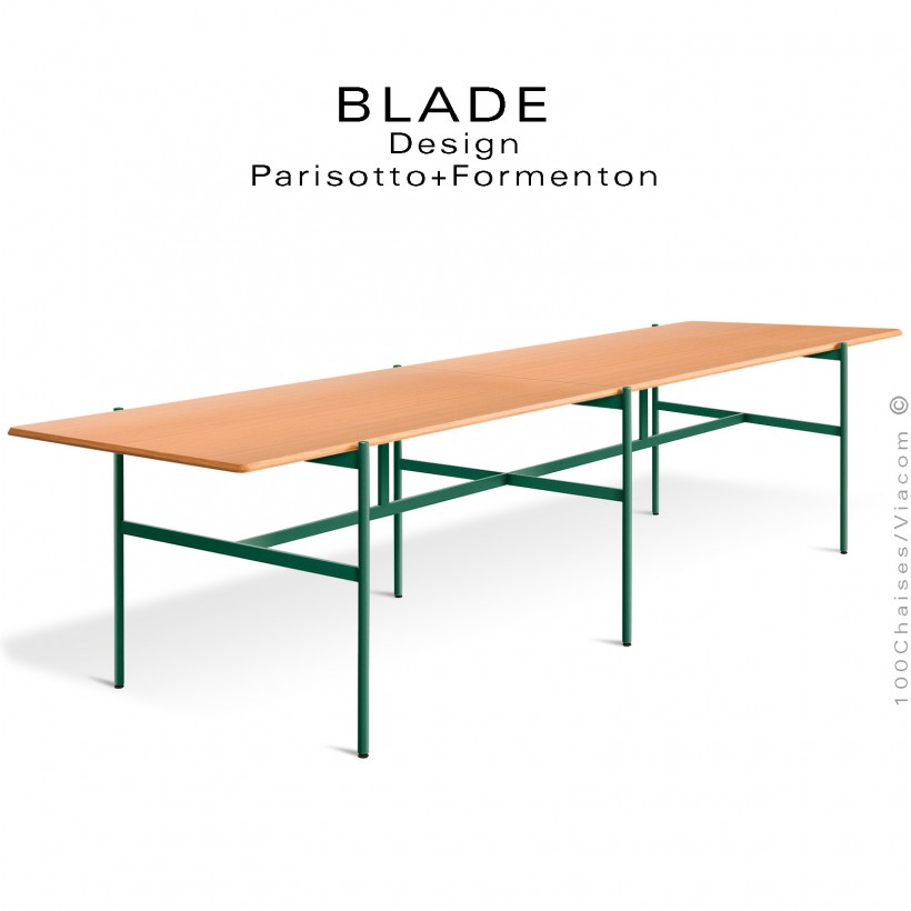 Grande table de réunion design BLADE, plateau rectangulaire, Chêne naturel, piétement tube d'acier peint vert bouteille.