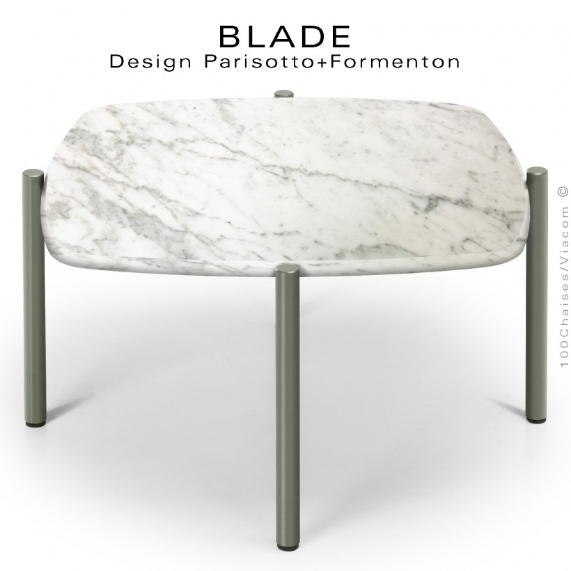 Table basse BLADE-CAFÉ, structure à 4 pieds peint gris ciment, plateau carré en marbre de Statuario de Carrara.