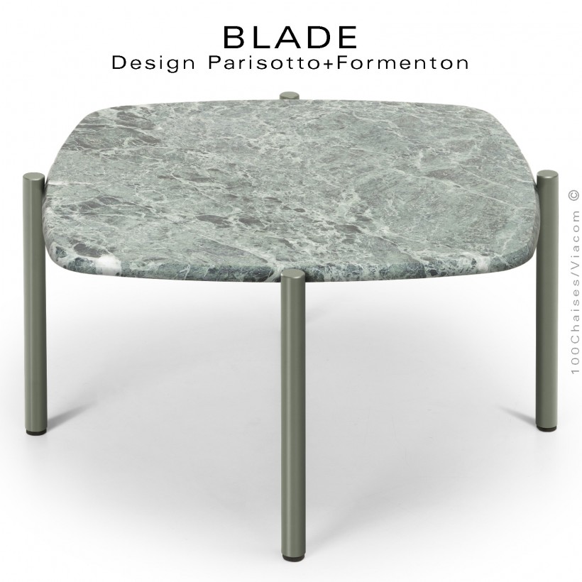 Table basse BLADE-CAFÉ, structure à 4 pieds peint gris ciment, plateau carré aux courbes douces en marbre de Verde Alpi.