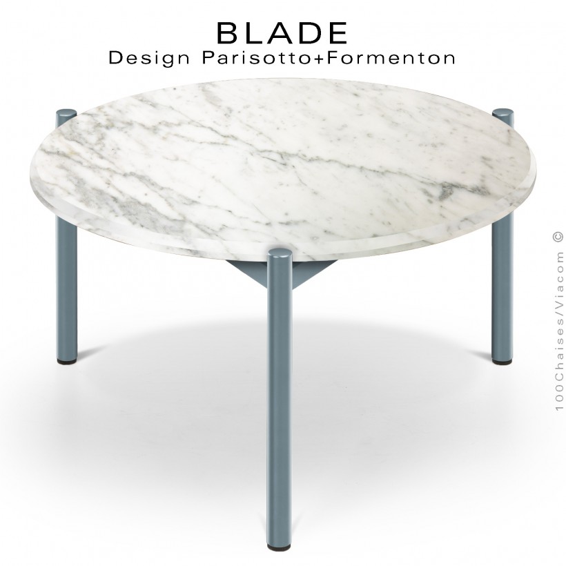 Table basse design BLADE-CAFÉ, structure à trois pieds en tube d'acier peint, plateau marbre couleur rond.