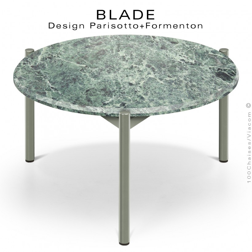 Table basse design BLADE-CAFÉ, structure 3 pieds en tube d'acier peint gris ciment, plateau marbre vert, Verde Alpi.