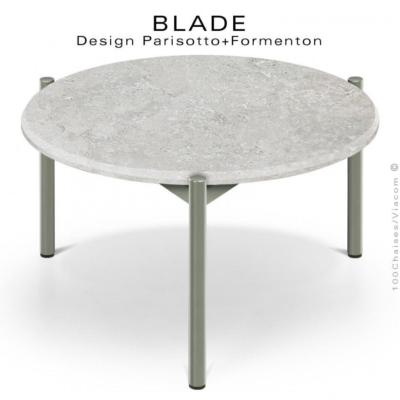 Table basse design BLADE-CAFÉ, structure 3 pieds en tube d'acier peint gris ciment, plateau pierre de Travertin gris.
