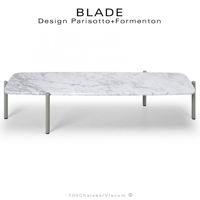 Table basse design BLADE-CAFÉ, structure 4 pieds en tube d'acier peint gris ciment, plateau marbre blanc, Statuario de Carrara.