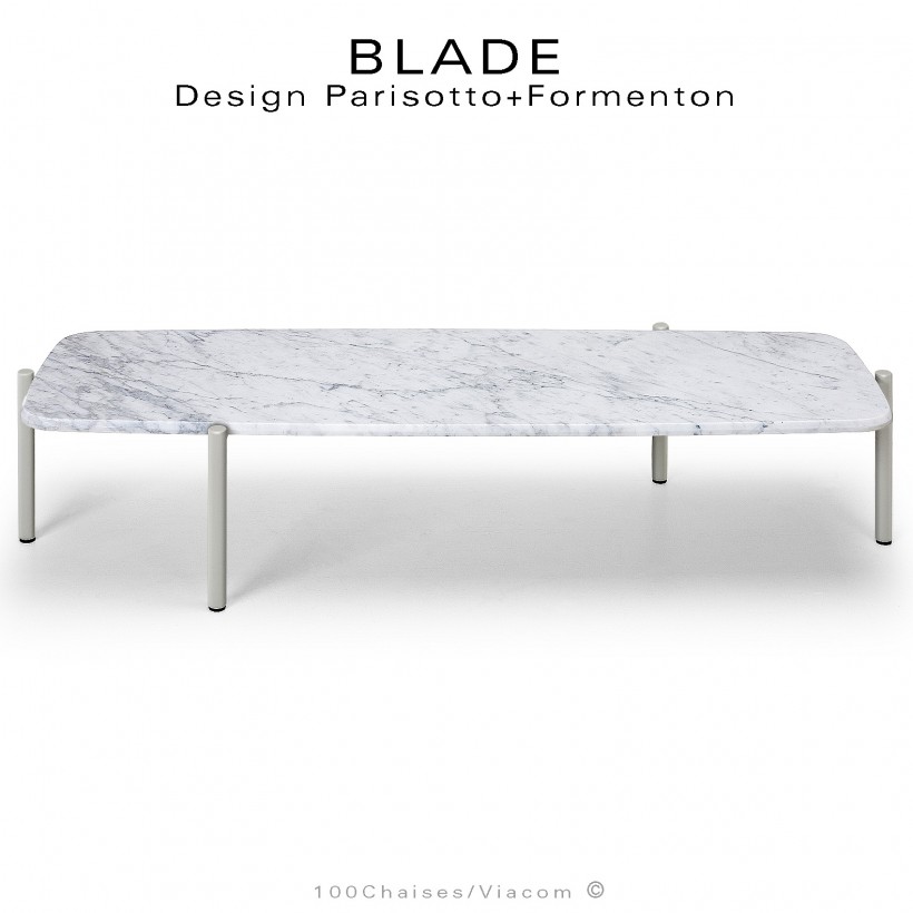 Table basse design BLADE-CAFÉ, structure 4 pieds en tube d'acier peint gris soie, plateau marbre blanc, Statuario de Carrara.