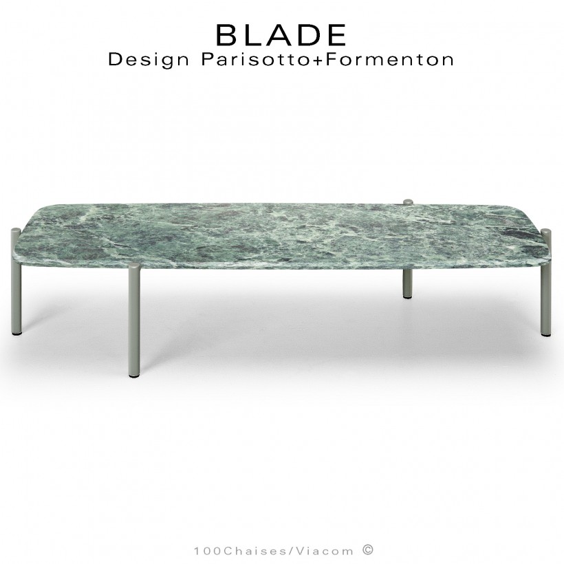 Table basse design BLADE-CAFÉ, structure 4 pieds en tube d'acier peint gris ciment, plateau marbre vert, Verde Alpi.