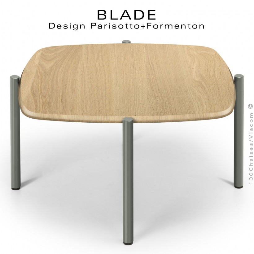 Table basse BLADE-CAFÉ, structure à 4 pieds en tube d'acier peint gris ciment, plateau chêne naturel vernis carré.