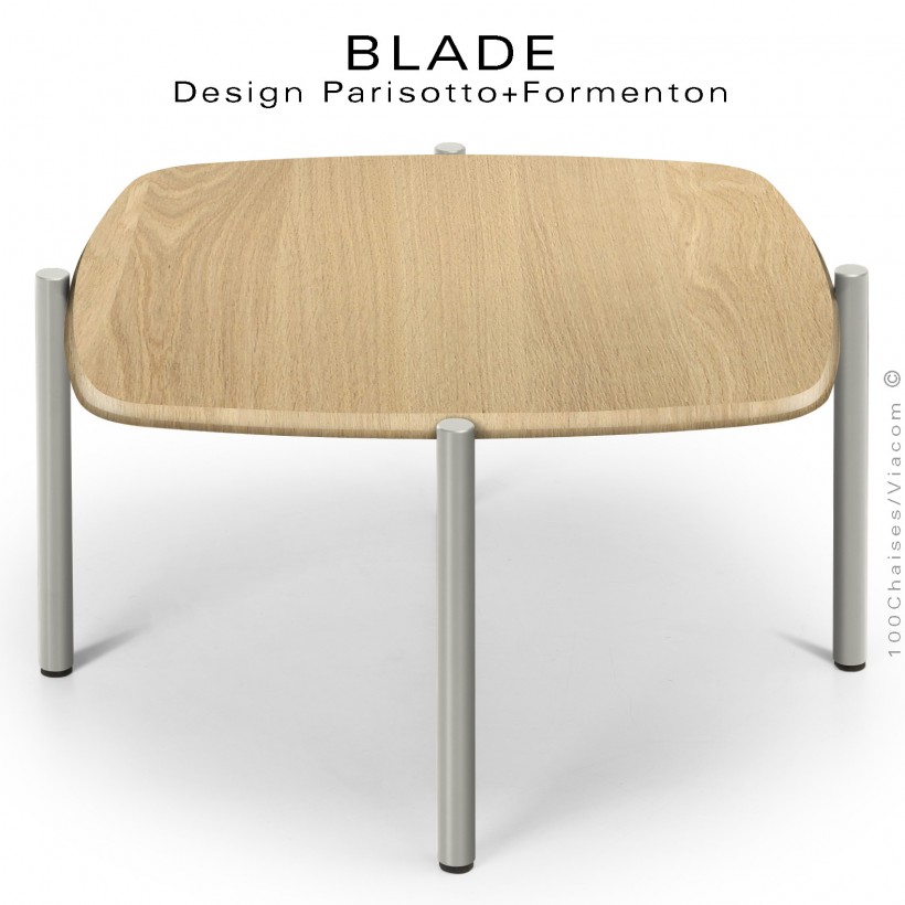 Table basse BLADE-CAFÉ, structure à 4 pieds en tube d'acier peint gris soie, plateau chêne naturel vernis carré.