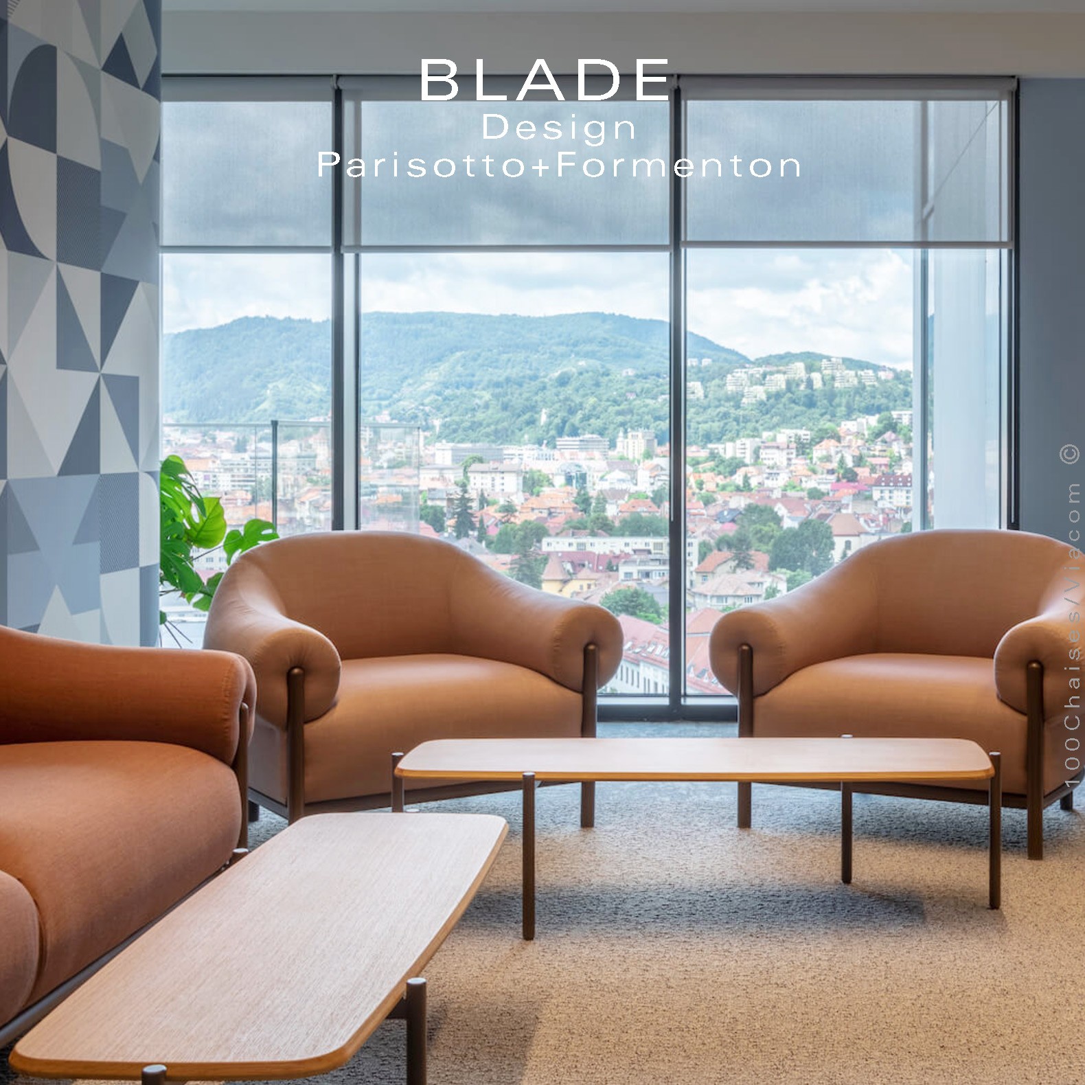 Table basse BLADE-CAFÉ, structure à 4 pieds en tube d'acier peint, plateau chêne ou noyer carré aux courbes douces et arrondies.