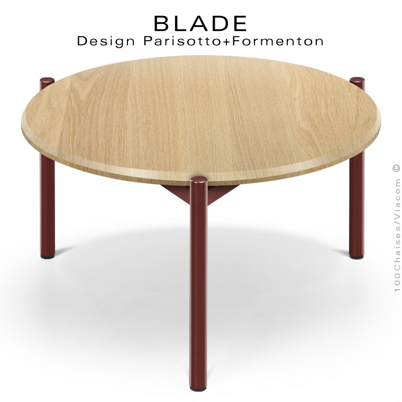 Table basse design BLADE-CAFÉ, structure à trois pieds en tube d'acier peint bordeaux, plateau bois massif chêne vernis rond.