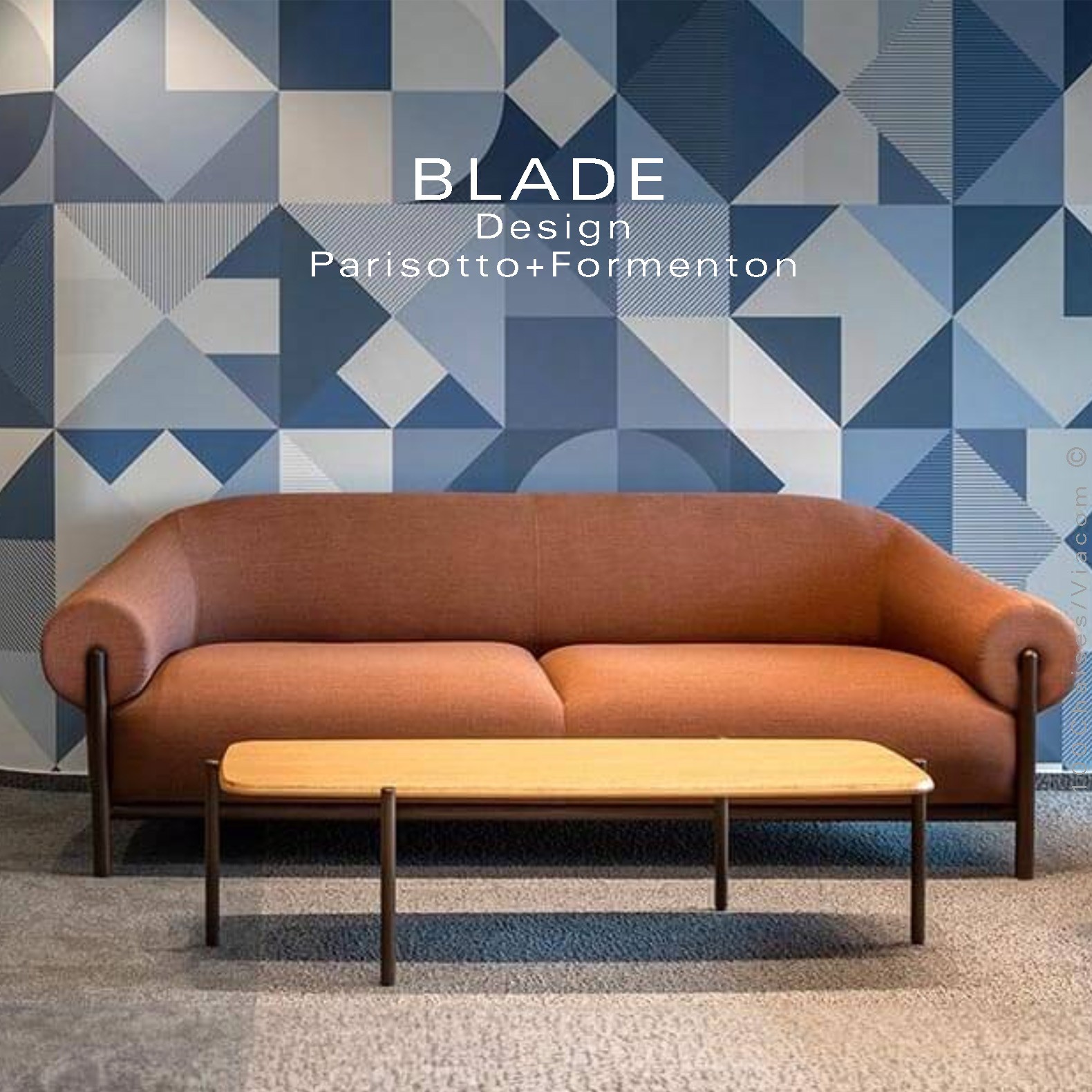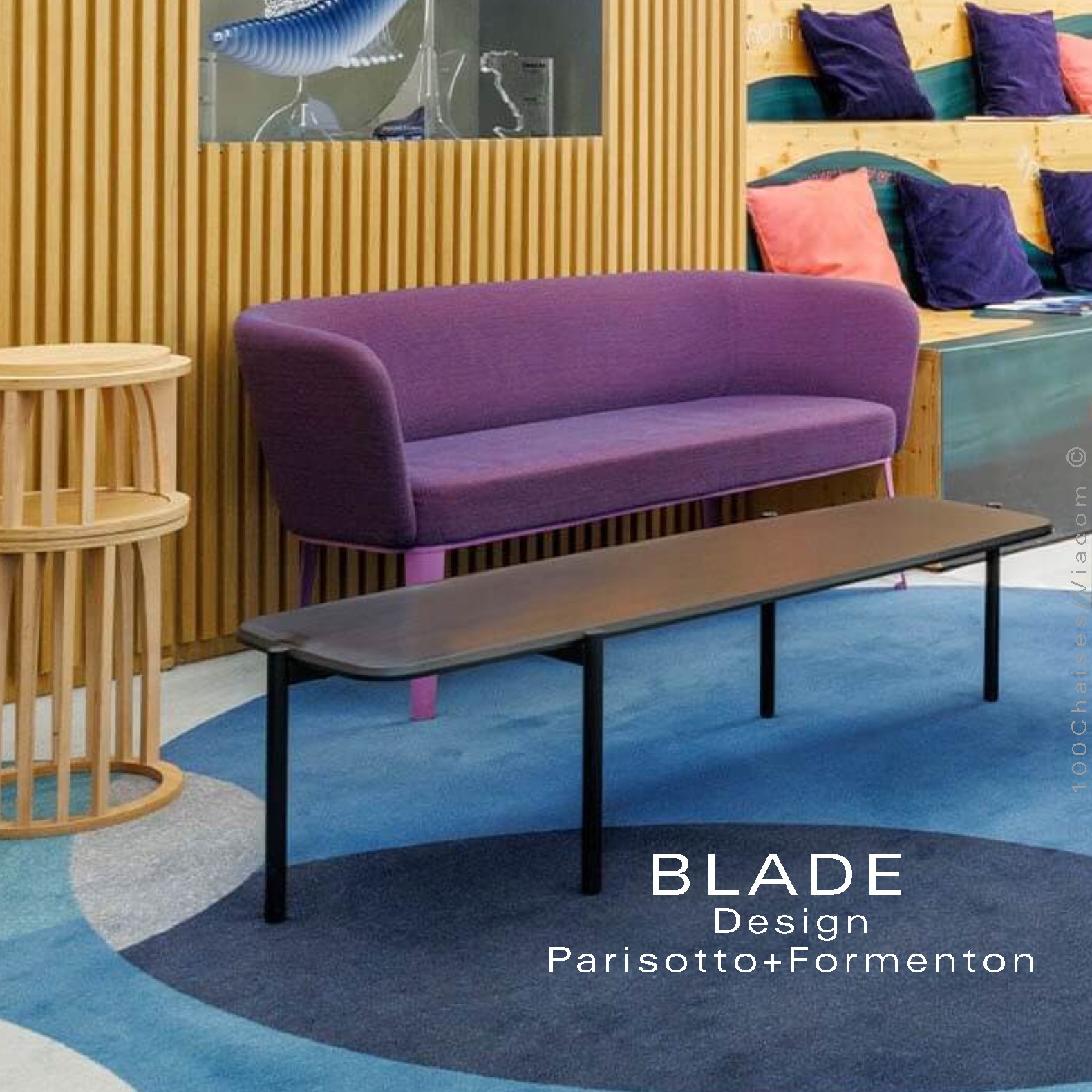 Table basse design BLADE-CAFÉ, structure à trois pieds en tube d'acier peint, plateau bois massif chêne ou noyer rond.