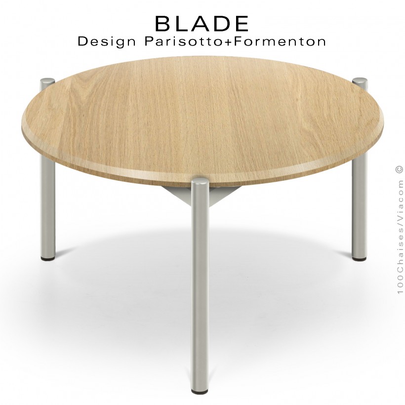 Table basse design BLADE-CAFÉ, structure à trois pieds en tube d'acier peint gris soie, plateau bois massif chêne vernis rond.