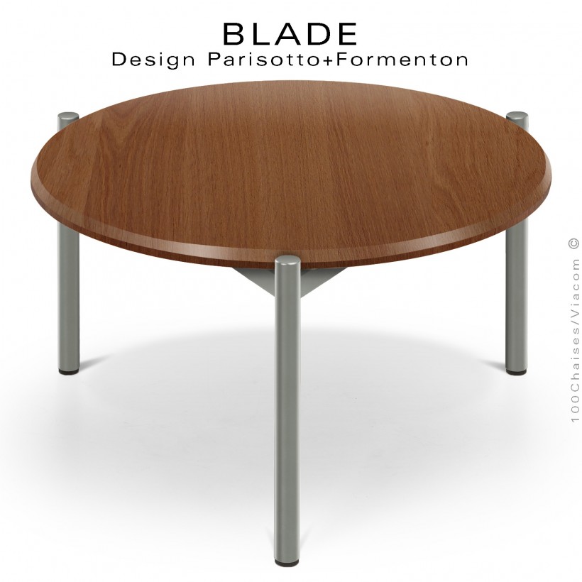 Table basse design BLADE-CAFÉ, structure à trois pieds en tube d'acier peint ciment, plateau bois massif noyer vernis rond.