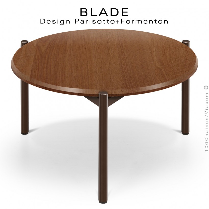 Table basse design BLADE-CAFÉ, structure à trois pieds en tube d'acier peint marron, plateau bois massif noyer vernis rond.