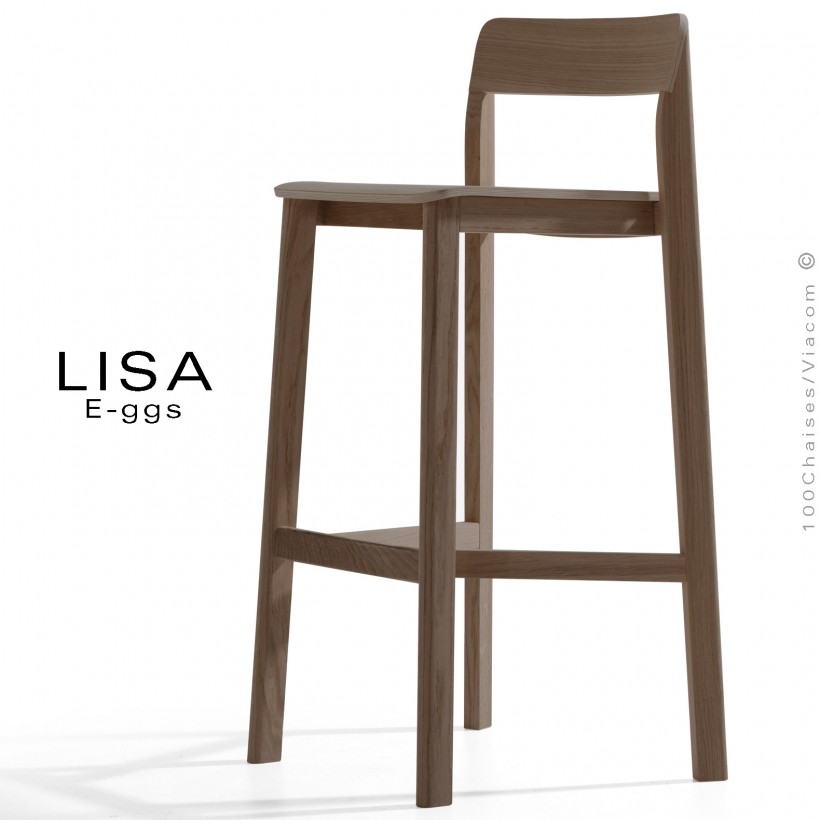Tabouret de bar en bois massif design, LISA, structure 4 pieds avec repose-pieds en bois massif de Frêne ou Chêne avec tampons plastiques de protection des sols plastiques. Assise et dossier en multiplis de bois de Frêne ou Chêne cintré à la vapeur. Les finitions standard sont le vernis incolore ou naturel et foncé, mais aussi dans une variété de couleur ou peinture fabricant ou RAL avec une finition brillante qui en font un complément transversal avec une grande flexibilité d'utilisation dans différents contextes. De construction simple et confortable, légère, empilable, compacte parfaite dans un bistrot et élégante dans la maison.