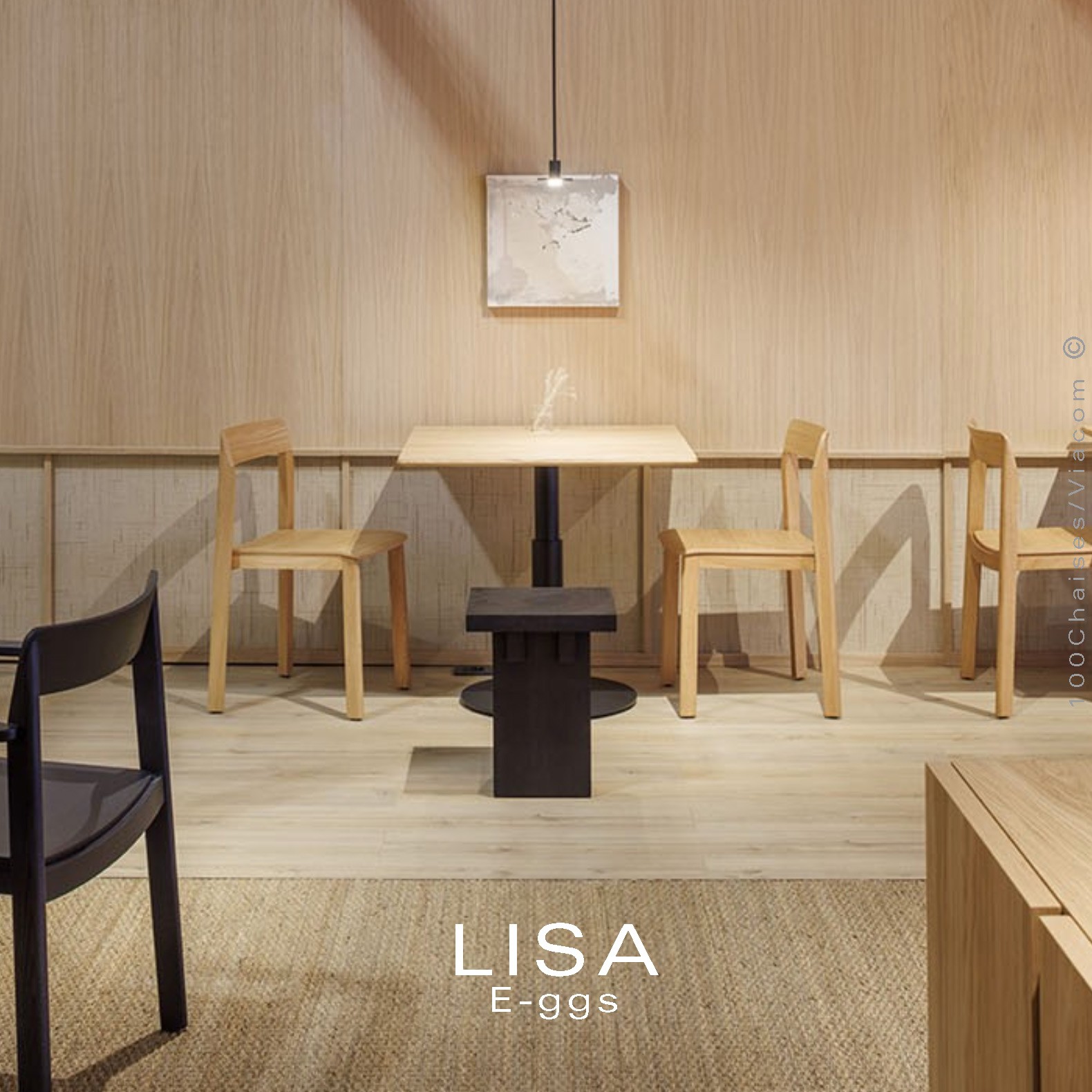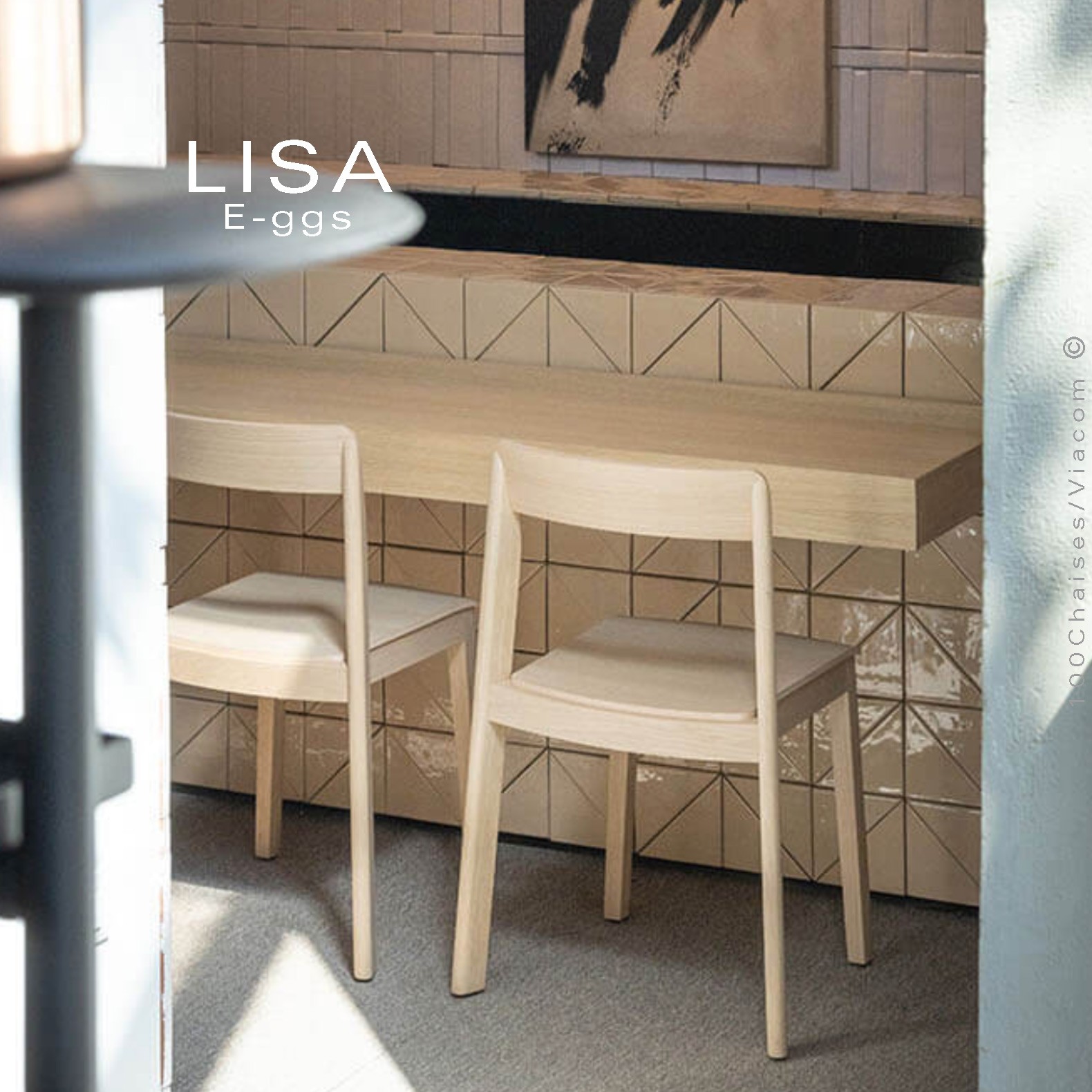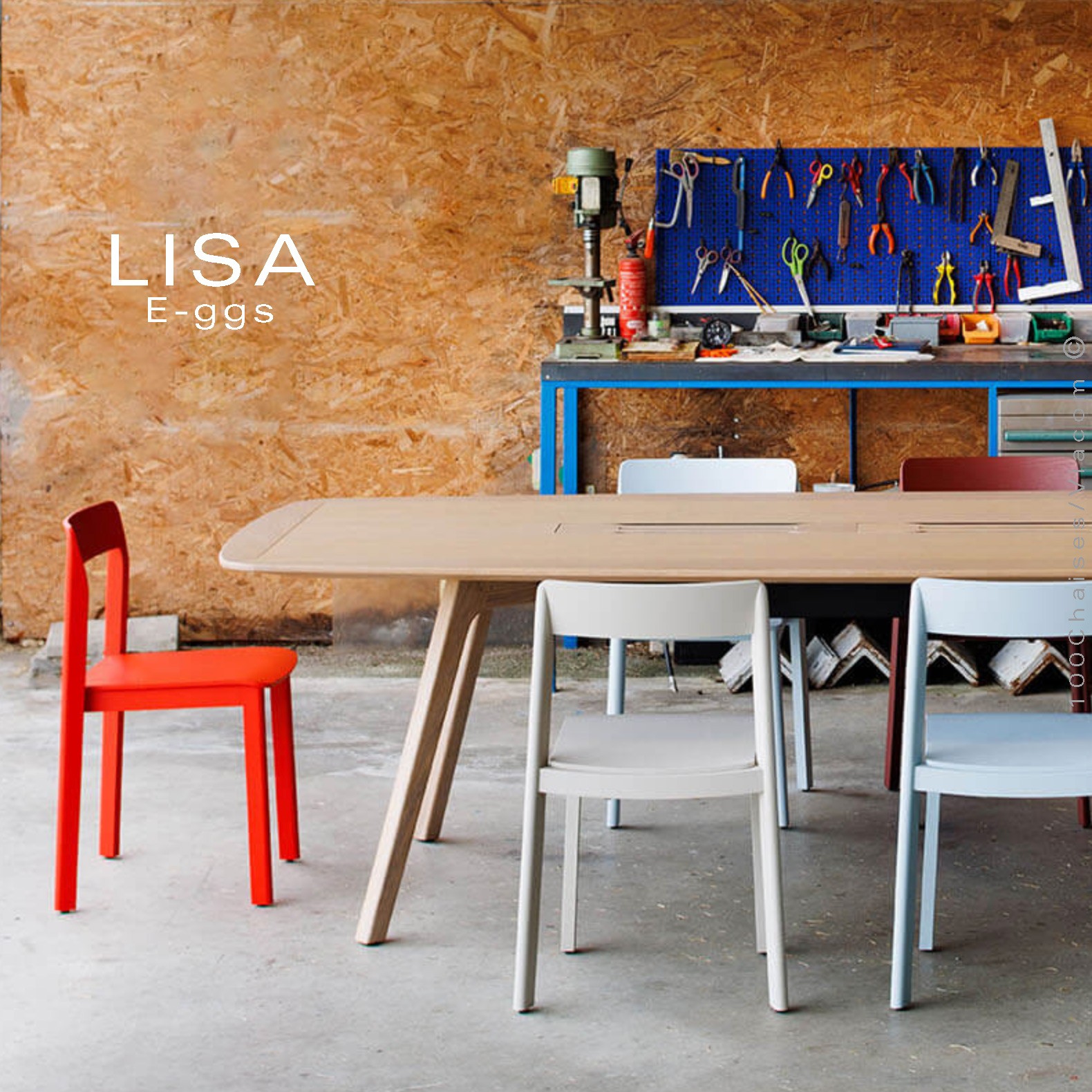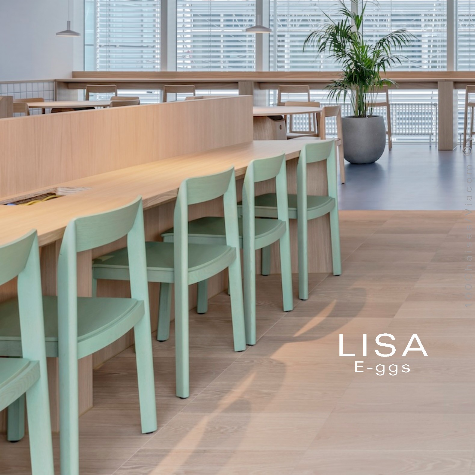 Fauteuil en bois massif design, LISA, structure 4 pieds en bois massif de Frêne ou de Chêne avec tampons plastiques de protection des sols plastiques. Assise et dossier en multiplis de bois de Frêne ou de chêne cintré. Les finitions standard sont le vernis naturel incolore ou noir, mais aussi dans une variété de couleur ou peinture fabricant ou RAL avec une finition brillante qui en font un complément transversal avec une grande flexibilité d'utilisation dans différents contextes. De construction simple et confortable, légère, empilable, compacte parfaite dans un bistrot et élégante dans la maison.