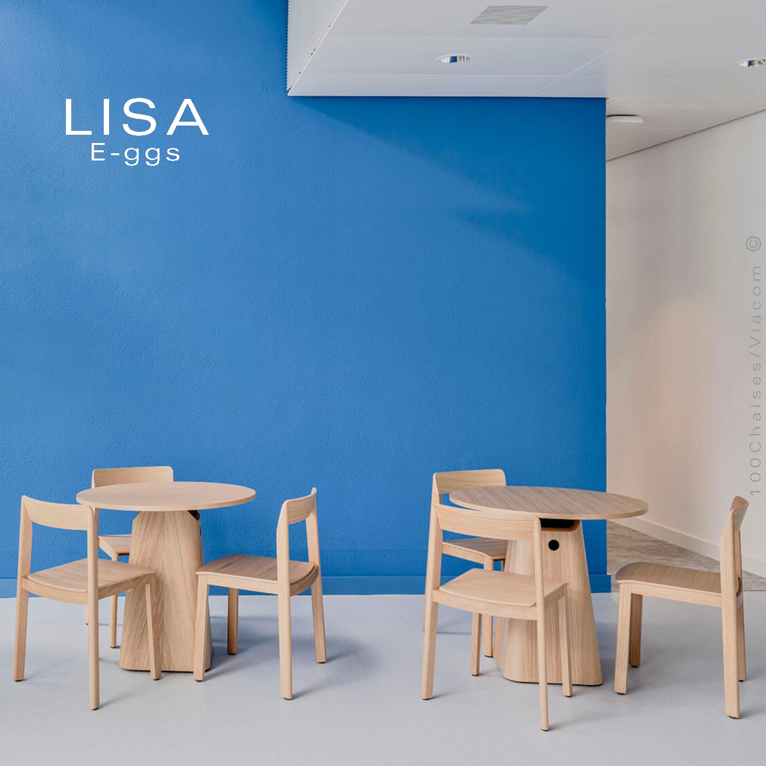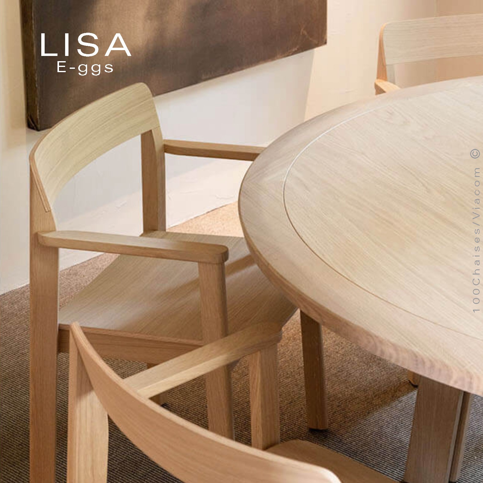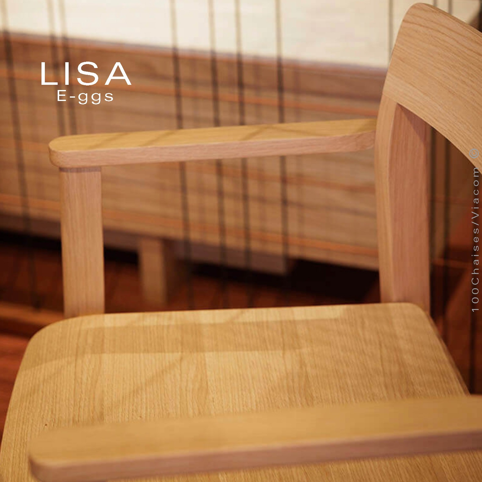 Fauteuil en bois massif design, LISA, structure 4 pieds en bois massif de Frêne ou de Chêne avec tampons plastiques de protection des sols plastiques. Assise et dossier en multiplis de bois de Frêne ou de chêne cintré. Les finitions standard sont le vernis naturel incolore ou noir, mais aussi dans une variété de couleur ou peinture fabricant ou RAL avec une finition brillante qui en font un complément transversal avec une grande flexibilité d'utilisation dans différents contextes. De construction simple et confortable, légère, empilable, compacte parfaite dans un bistrot et élégante dans la maison.