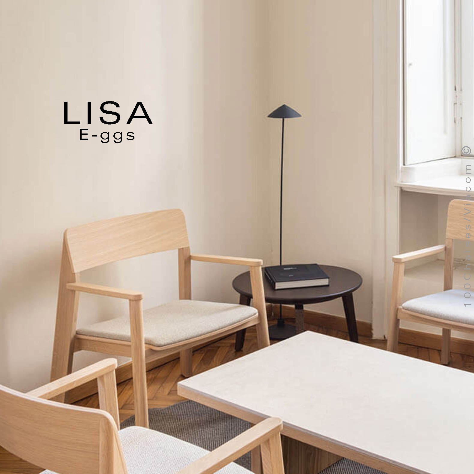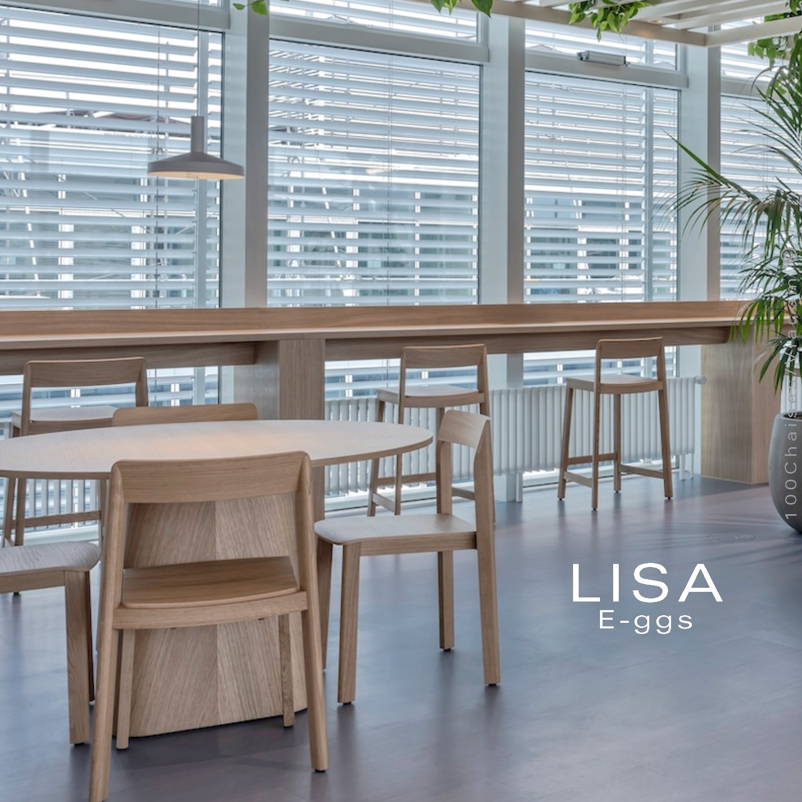 La chaise Lisa se distingue par son assise en bois courbé et ses pieds en bois massif, avec des finitions personnalisables (frêne, chêne, chêne foncé). Elle est idéale pour les espaces professionnels et se décline en version standard (50 cm de large) et XL (60 cm de large, avec ou sans accoudoirs). Le fauteuil Lounge Lisa, avec ses 69 cm d’assise, offre confort et style pour les moments de détente.