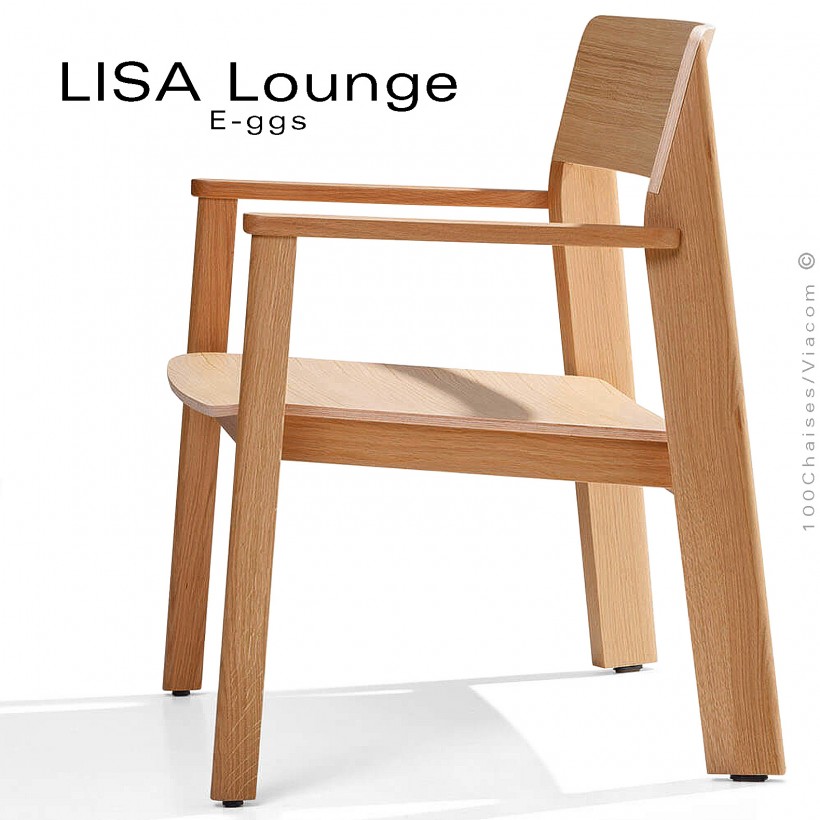 Fauteuil lounge design LISA, structure 4 pieds en bois de Chêne, assise multiplis cintré, vernis incolore.