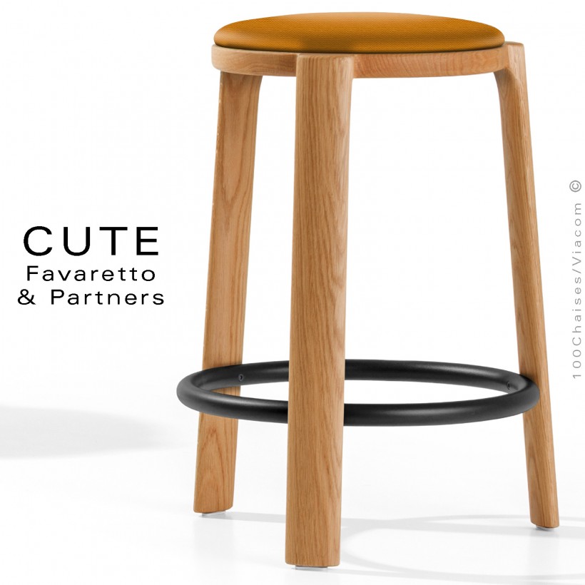 Tabouret de cuisine CUTE, structure Chêne massif vernis, assise garnie, habillage tissu couleur orange pour intérieur.