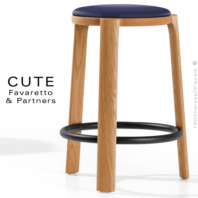 Tabouret de cuisine CUTE, structure Chêne massif vernis, assise garnie, habillage tissu couleur bleu nuit pour intérieur.