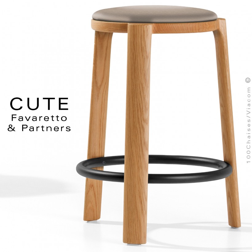 Tabouret de cuisine CUTE, structure Chêne massif vernis, assise garnie, habillage tissu couleur gris Tourterelle.
