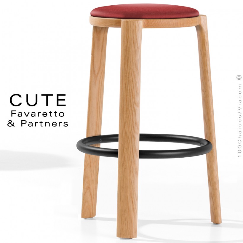Conçu pour allier confort et stabilité, le tabouret de bar CUTE est fabriqué en chêne, frêne ou noyer massif. Il se décline en deux hauteurs (65 ou 75 cm) pour s'adapter à différents espaces et usages. Sa structure à trois pieds est renforcée par un repose-pieds métallique peint en noir qui entoure la base, offrant ainsi un soutien solide et une grande robustesse. L'assise, garnie de mousse polyuréthane, offre un confort optimal. L'habillage est réalisé en tissu de la gamme MAYA du fabricant FIDIVI, 100 % Trevira CS, ignifugé AM18 (NF D 60013) et M1 (NF P 92501-7) pour la France. Avec son design minimaliste et sa construction solide, CUTE est le tabouret idéal pour ceux qui recherchent un compromis entre fonctionnalité et esthétique.